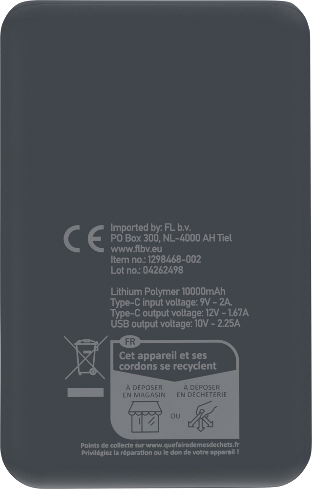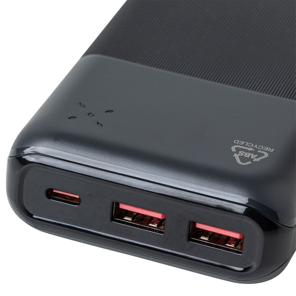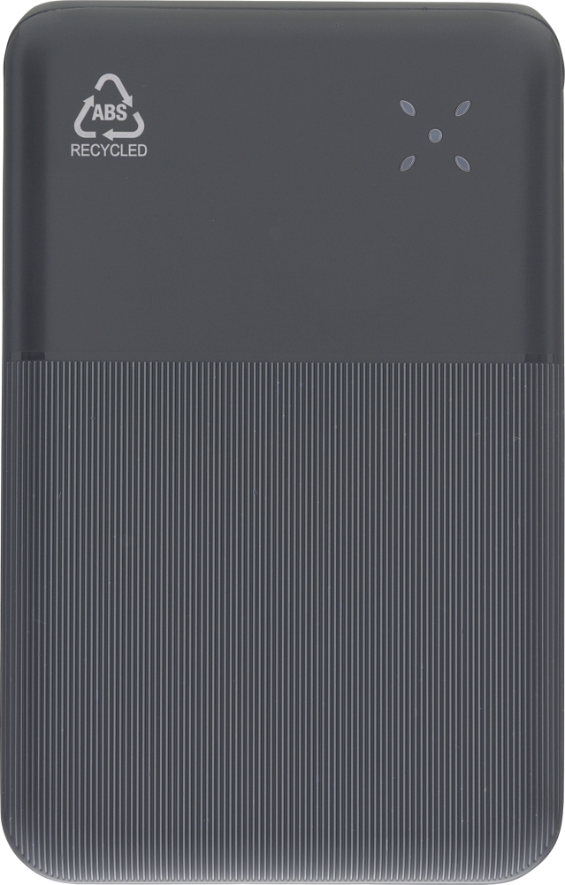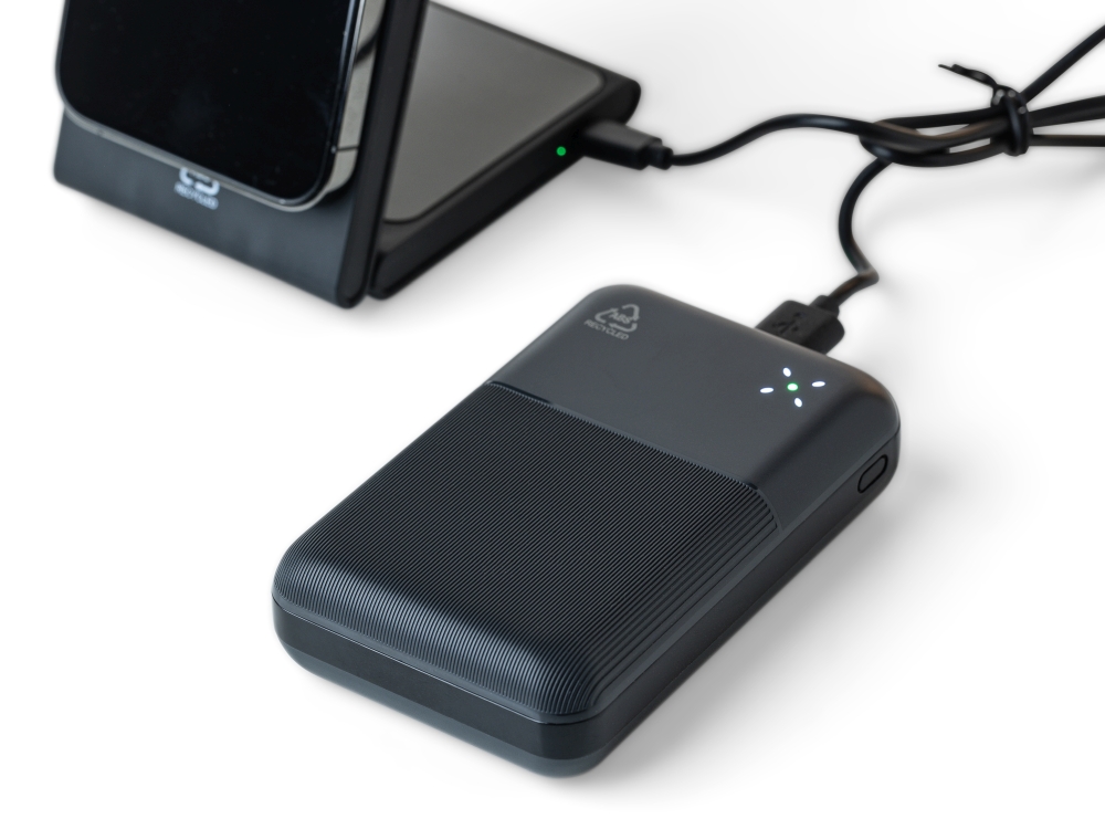 Powerbanka z recyklovaného ABS plastu (20 000 mAh). Rychlé nabíjení 22,5 W. Vstup/výstup typu C, vstup typu A. LED indikátor, bezpečnostní prvky. Logo z recyklovaného ABS plastu na zadní straně. Baleno v hnědé krabičce s hedvábným papírem. Rozměry: 3 cm x 11 cm