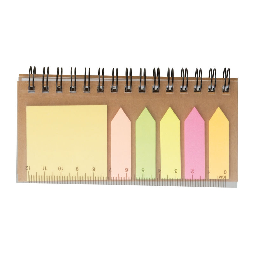 Sada 5 barev značkovacích lístků a samolepicího bočku (25 ks od každého) s integrovaným pravítkem a poznámkovým bločkem s 80 linkovanými stranami. Rozměry: 13,6 × 7,2 × 1,3 cm.