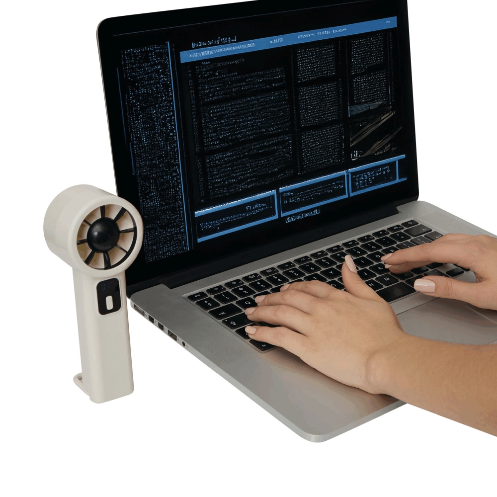 Přenosný ventilátor: 6 rychlostí, také manuálně nastavitelný, s ukazatelem úrovně nabití a rychlosti, rukojeť/stojan umožňuje použití jako stolní ventilátor, výkonná lithiová baterie, kapacita: 1 200 mAh, včetně nabíjecího kabelu USB s konektorem USB typu C (délka cca 19 cm), baleno v dárkové krabičce. Rozměry: 16,2 x 6,2 x 5,1 cm