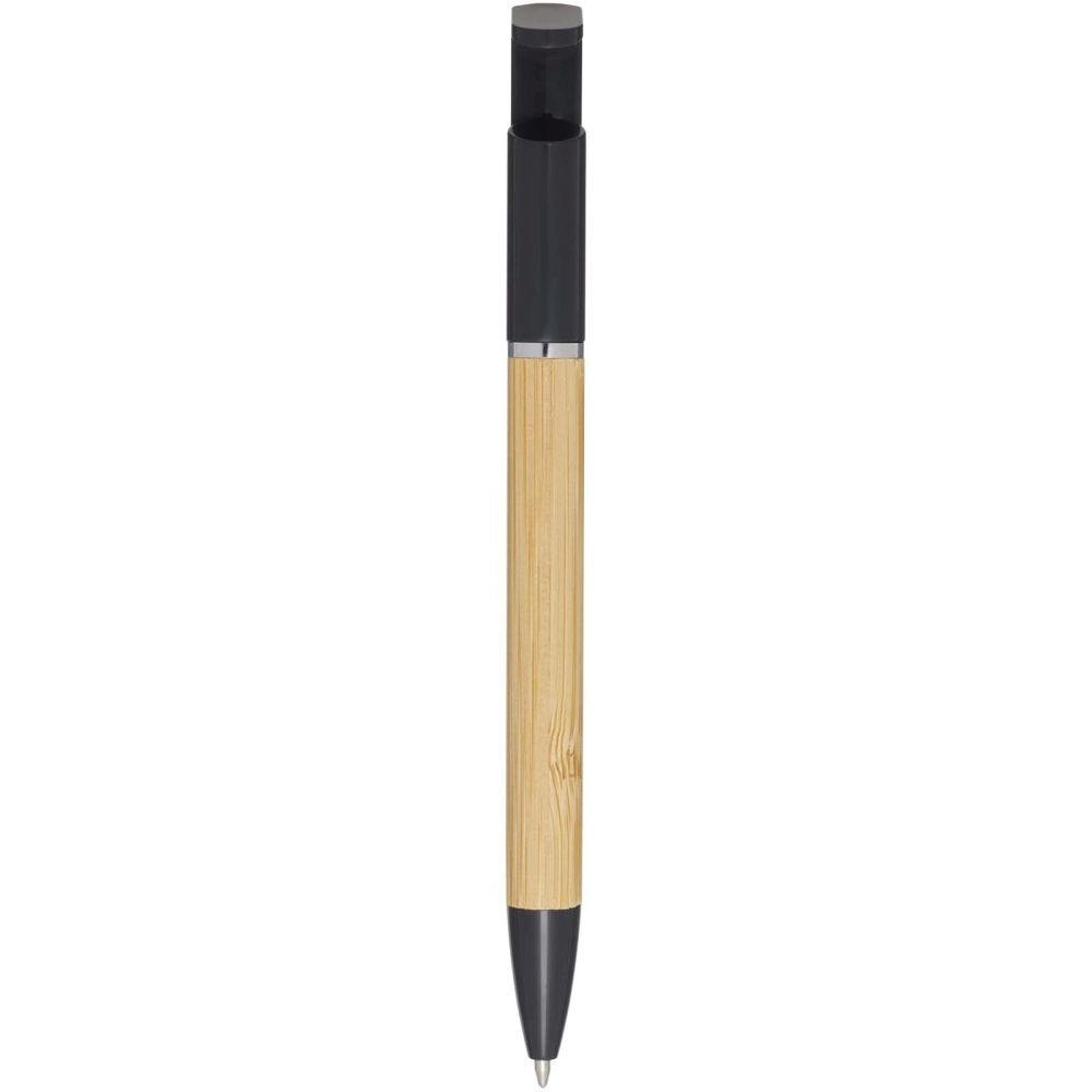 Bambusová propiska, která funguje také jako držák na telefon. Tlačítko a středový kroužek jsou vyrobeny z recyklovaného plastu, hrot z mosazi a tělo z bambusu z odpovědných zdrojů. Barva inkoustu: Černá. Délka psaní: 1000 metrů. Rozměr hrotu: 1,0 mm. Rozměry: 14,7 x O 1 cm