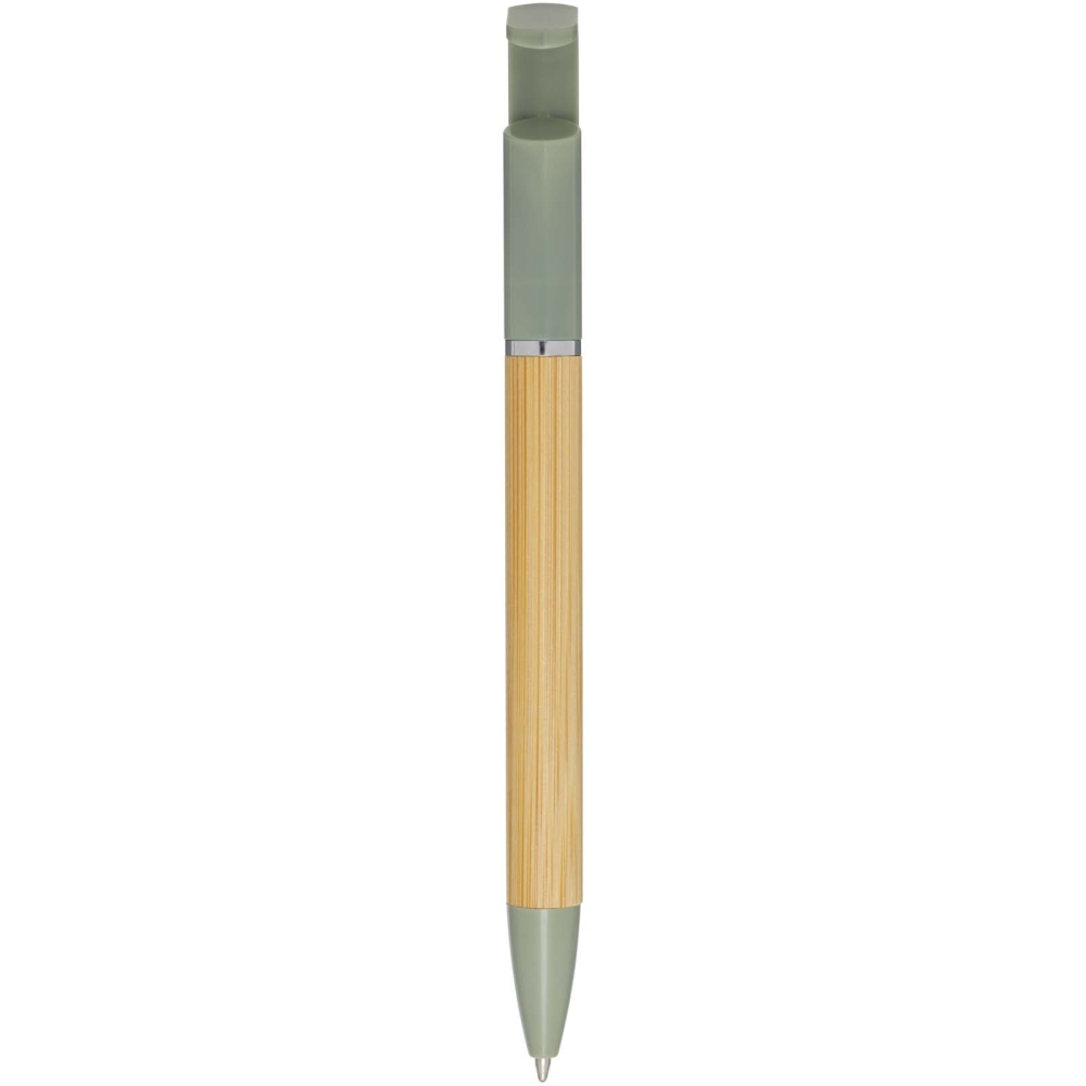Bambusová propiska, která funguje také jako držák na telefon. Tlačítko a středový kroužek jsou vyrobeny z recyklovaného plastu, hrot z mosazi a tělo z bambusu z odpovědných zdrojů. Barva inkoustu: Modrá. Délka psaní: 1000 metrů. Rozměr hrotu: 1,0 mm. Rozměry: 14,7 x O 1 cm