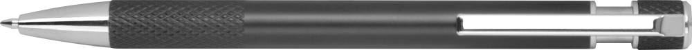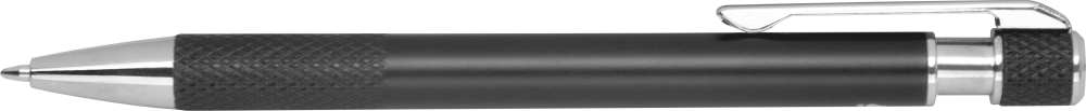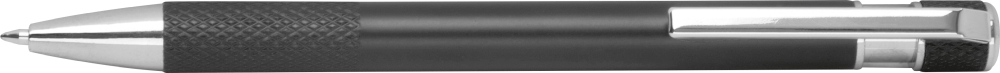 Propiska z recyklovaného hliníku se vzorovaným úchopem, tlačítkovým mechanismem a modrou náplní. Rozměry: o 1 x 14,2 cm