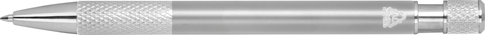 Propiska z recyklovaného hliníku se vzorovaným úchopem, tlačítkovým mechanismem a modrou náplní. Rozměry: o 1 x 14,2 cm