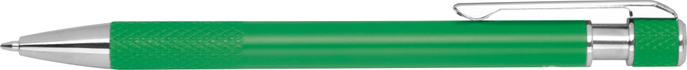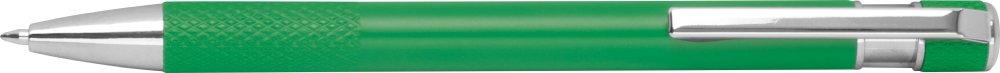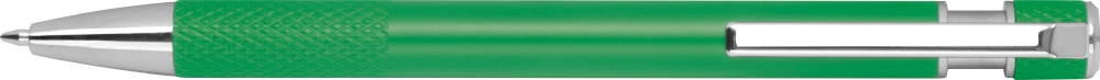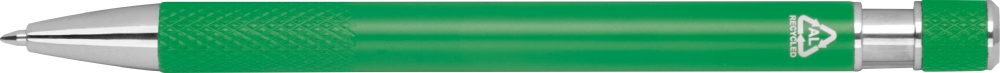 Propiska z recyklovaného hliníku se vzorovaným úchopem, tlačítkovým mechanismem a modrou náplní. Rozměry: o 1 x 14,2 cm