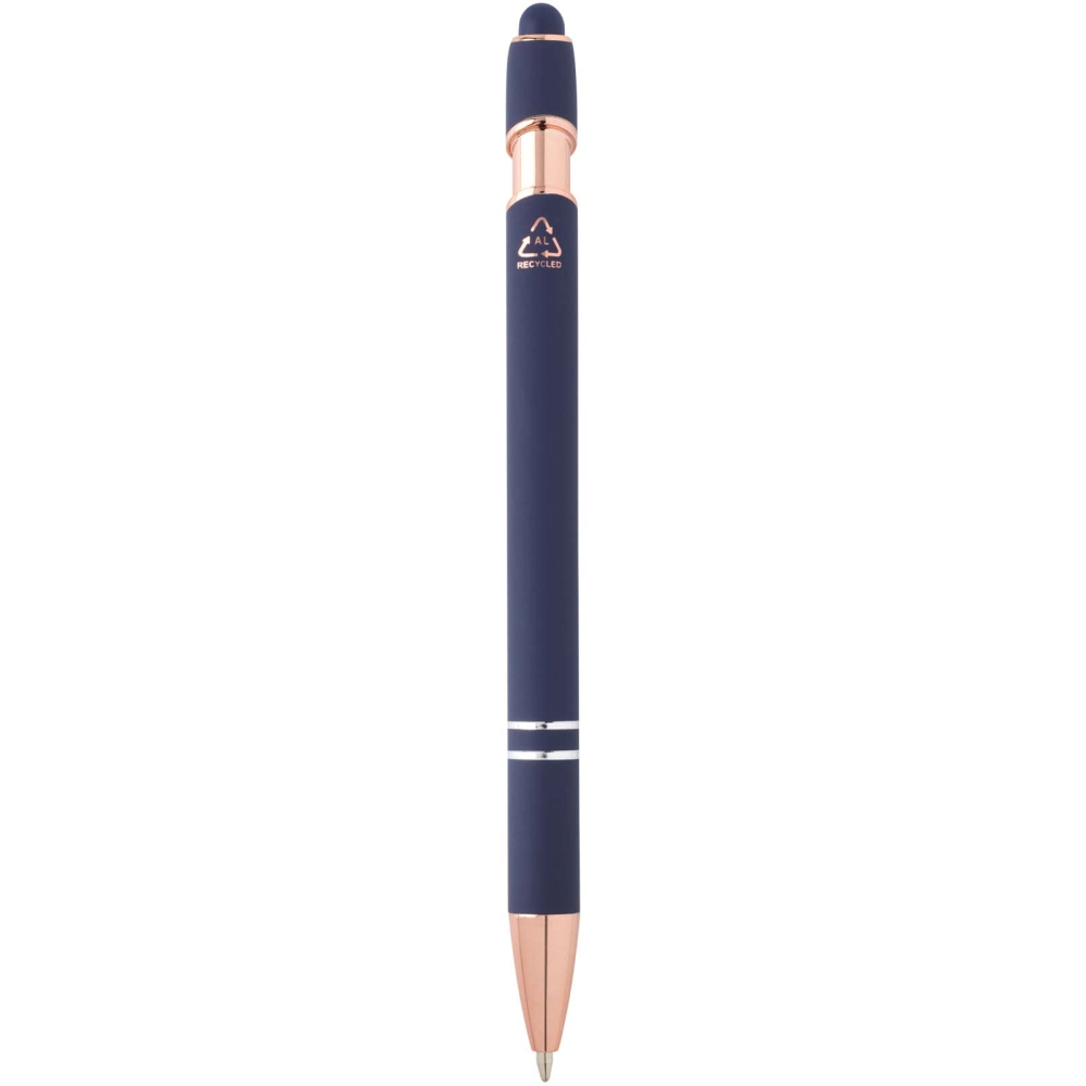 Propiska s povrchovou úpravou z růžového zlata má tělo vyrobené z recyklovaného hliníku a dotykový stylus vyrobený ze silikonu. Snižuje také množství odpadu na skládkách a pomáhá šetřit přírodní zdroje s cílem snížit emise skleníkových plynů. Barva inkoustu: Modrá. Délka psaní: 800 metrů. Rozměr hrotu: 1,0 mm. Rozměry: 14,4 x O 1 cm