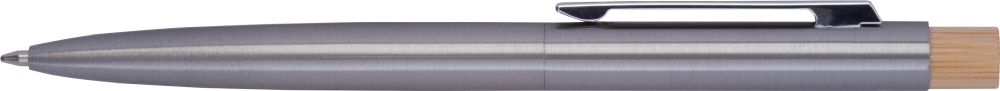 Propiska z nerezové oceli s bambusovým tlačítkem a velkokapacitní modrou náplní. Rozměry: o 0,9 x 13,9 cm