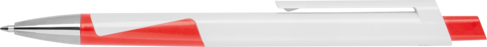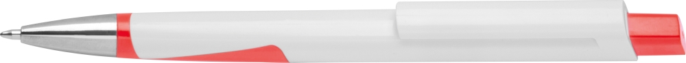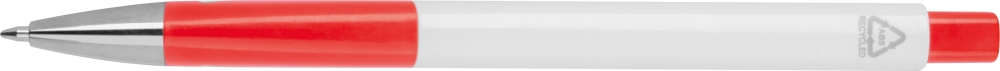 Bílá propiska z recyklovaného plastu s modrou náplní. Rozměry: 14,5 x 1,1 x 1 cm