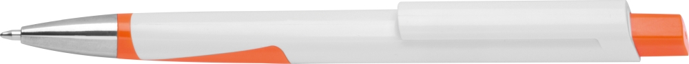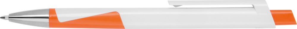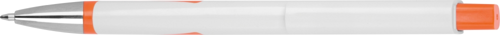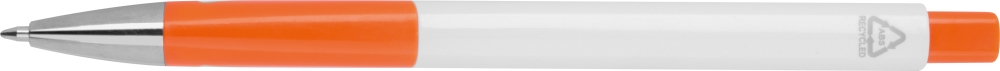Bílá propiska z recyklovaného plastu s modrou náplní. Rozměry: 14,5 x 1,1 x 1 cm