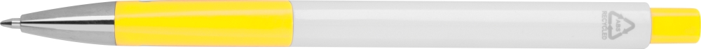 Bílá propiska z recyklovaného plastu s modrou náplní. Rozměry: 14,5 x 1,1 x 1 cm