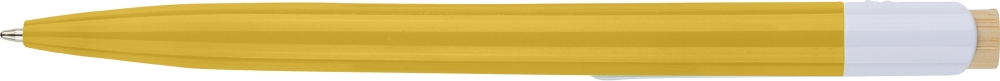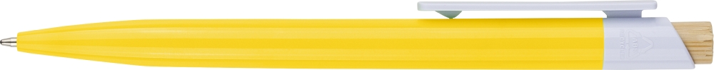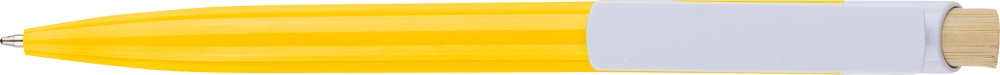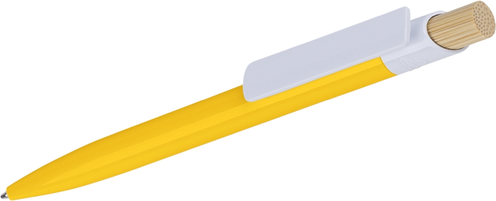 Propiska z recyklovaného ABS plastu s bambusovým tlačítkem a bílým klipem, vhodné pro digitální tisk. Přibližná délka psaní 600 metrů. Modrý inkoust. Rozměry: 1 cm x 1,4 cm x 14,4 cm.