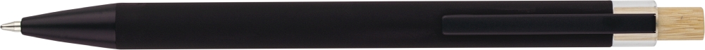 Propiska z recyklovaného hliníku s bambusovým tlačítkem a detailem z AS plastu. Součástí je kovový klip a plastový hrot, obojí ve sladěných barvách. Na těle je laserově gravírované recyklované logo. Přibližná délka psaní 800 metrů. Modrý inkoust. Rozměry: 1 cm x 1,25 cm x 14 cm.