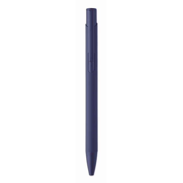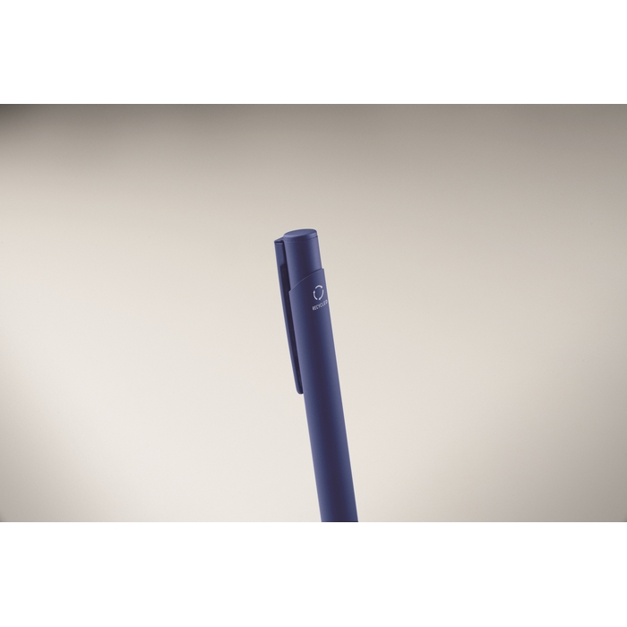 Tlačítková propiska z recyklovaného hliníku s železným klipem a barevným pogumovaným tělem. Modrý inkoust. Rozměry: 13.5 x 1.0 cm