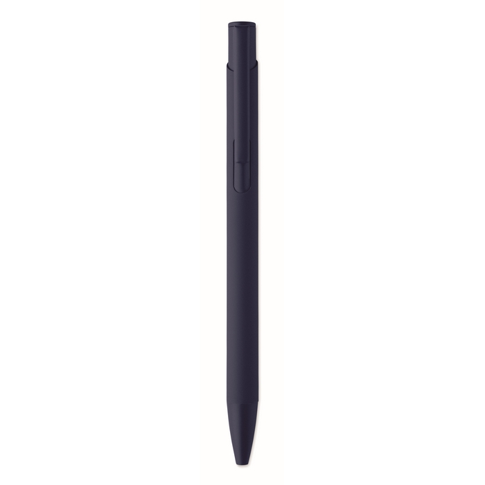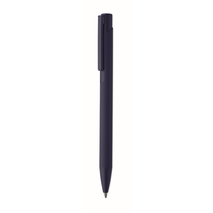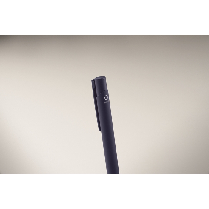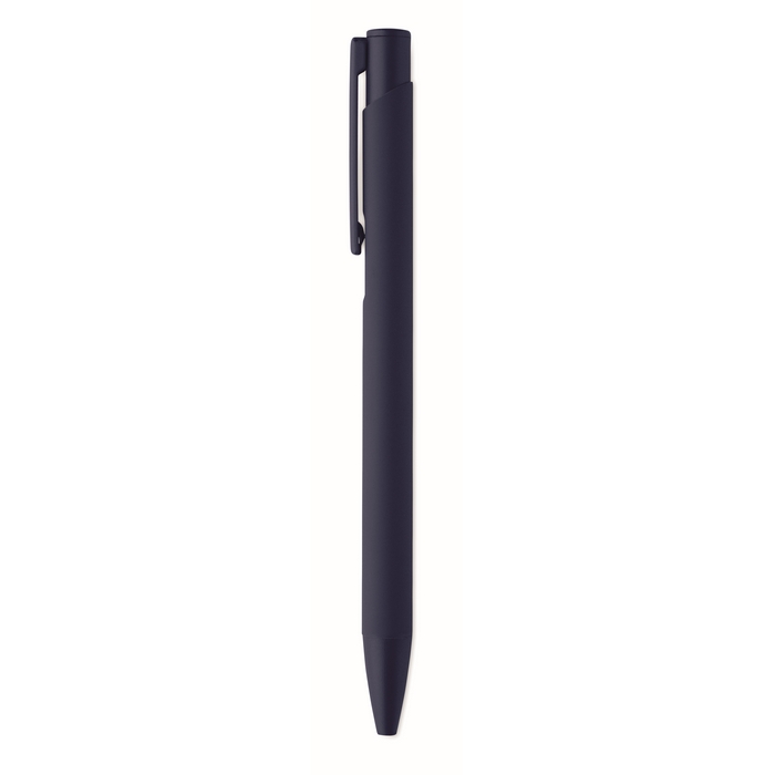 Tlačítková propiska z recyklovaného hliníku s železným klipem a barevným pogumovaným tělem. Modrý inkoust. Rozměry: 13.5 x 1.0 cm
