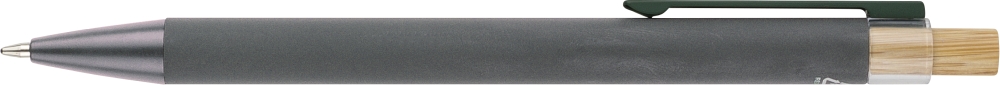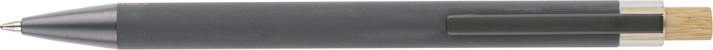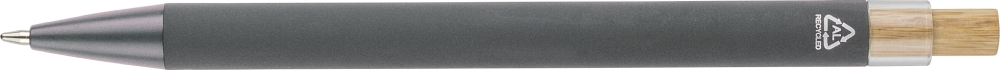 Propiska z recyklovaného hliníku s bambusovým tlačítkem a detailem z AS plastu. Součástí je kovový klip a plastový hrot, obojí ve sladěných barvách. Na těle je laserově gravírované recyklované logo. Přibližná délka psaní 800 metrů. Modrý inkoust. Rozměry: 1 cm x 1,25 cm x 14 cm.
