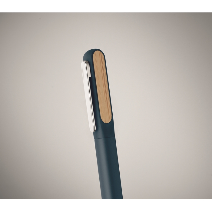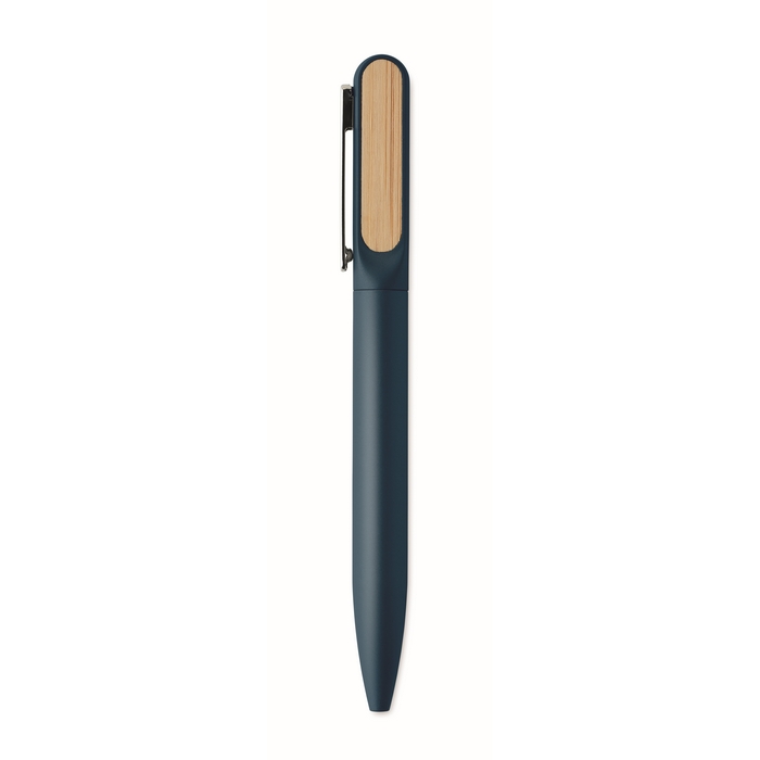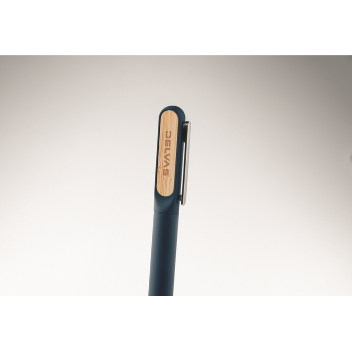 Kuličkové pero s tělem z recyklovaného hliníku, otočnou částí z recyklovaného ABS a kovovým klipem s bambusovým detailem. Modrý inkoust. Rozměry: 14 x 1.2 cm