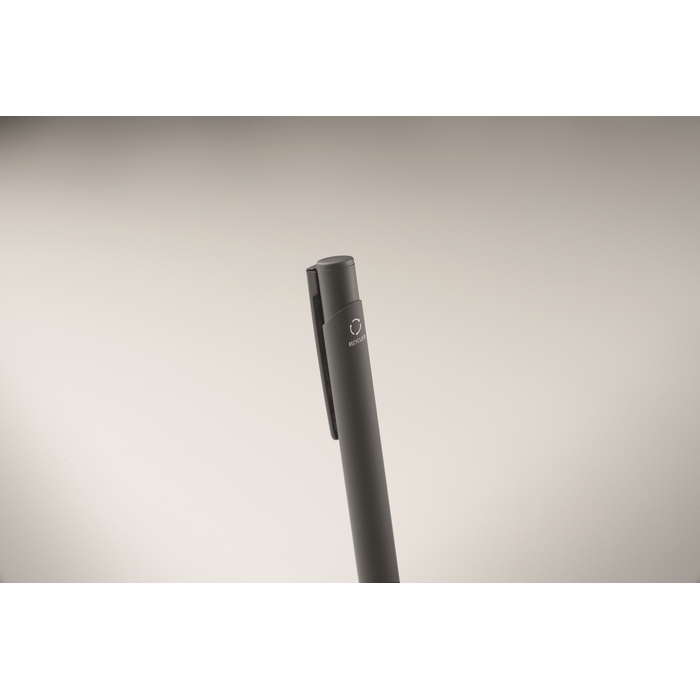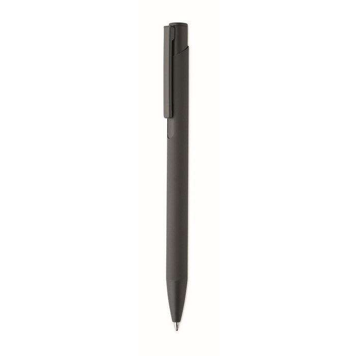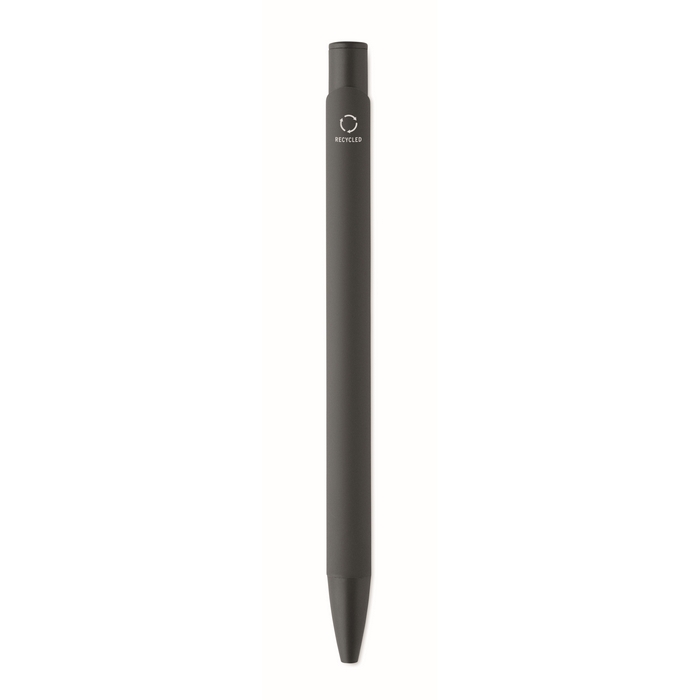 Tlačítková propiska z recyklovaného hliníku s železným klipem a barevným pogumovaným tělem. Modrý inkoust. Rozměry: 13.5 x 1.0 cm