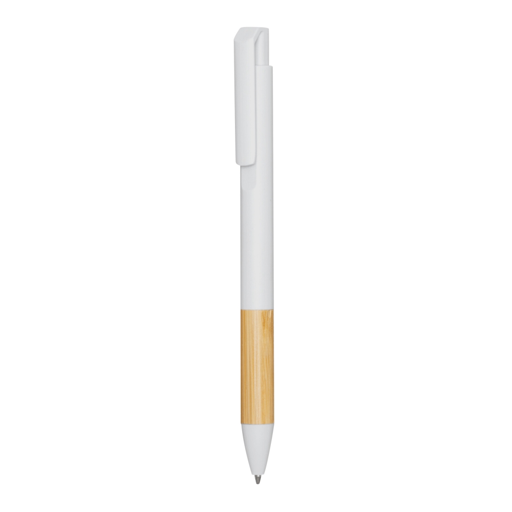 Propiska, tělo z recyklovaného plastu, tlačítkový mechanismus, lakovaná bambusová úchopová plocha, modrý inkoust. Rozměry: 14,3 cm