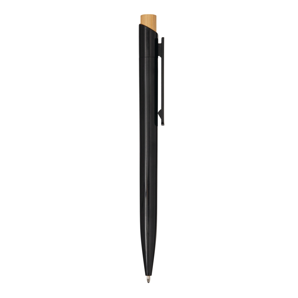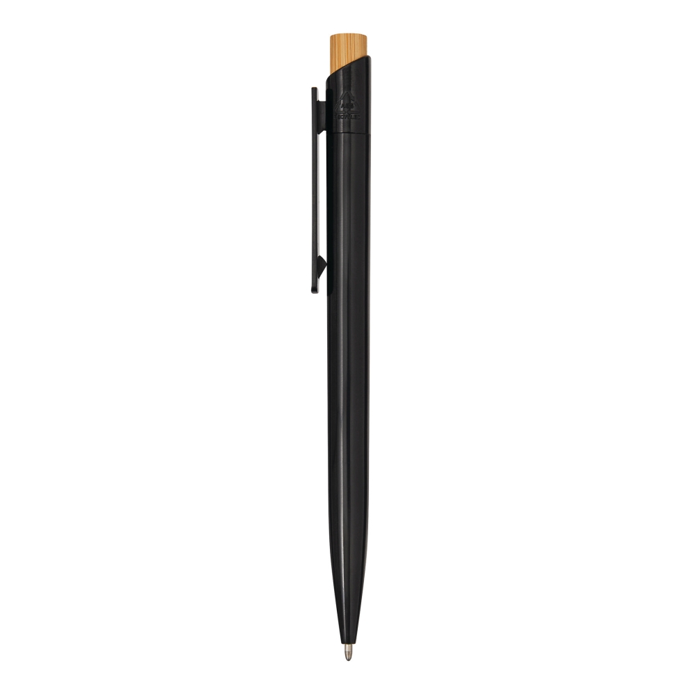Propiska, tělo z recyklovaného plastu, tlačítkový mechanismus, tlačítko z bambusu, modrý inkoust. Rozměry: 13,5 cm