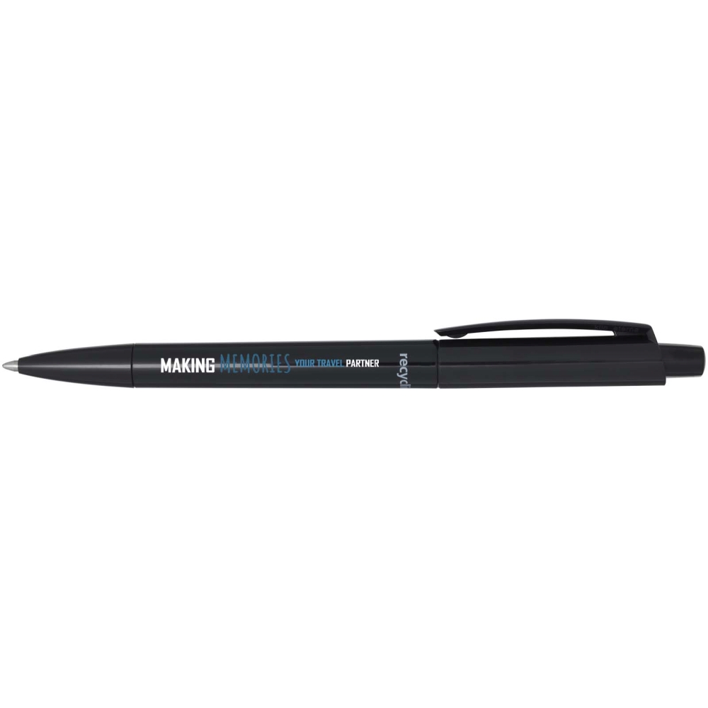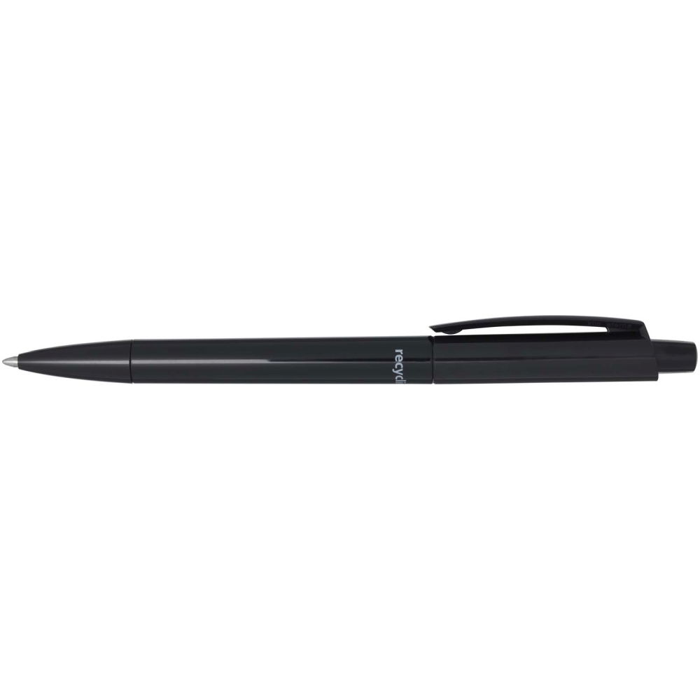 Propiska s tělem a sponou z recyklovaného plastu a hrotem z nerezové oceli. Barva inkoustu: Černá. Délka psaní: 3000 metrů. Rozměr hrotu: 1,00 mm. Vyrobeno v Německu. Rozměry: 14,8 x O 1,05 cm