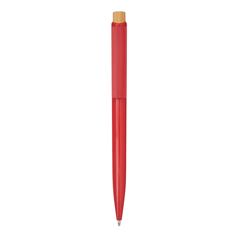 Propiska, tělo z recyklovaného plastu, tlačítkový mechanismus, tlačítko z bambusu, modrý inkoust. Rozměry: 13,5 cm