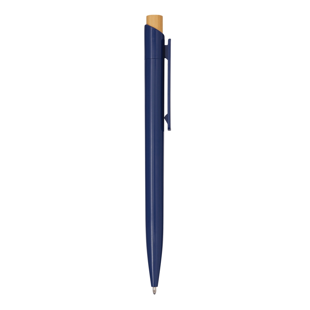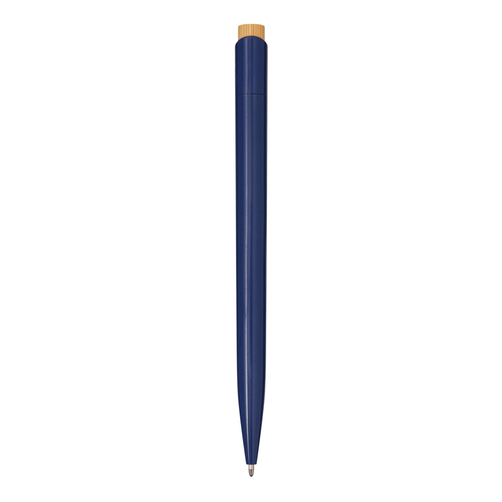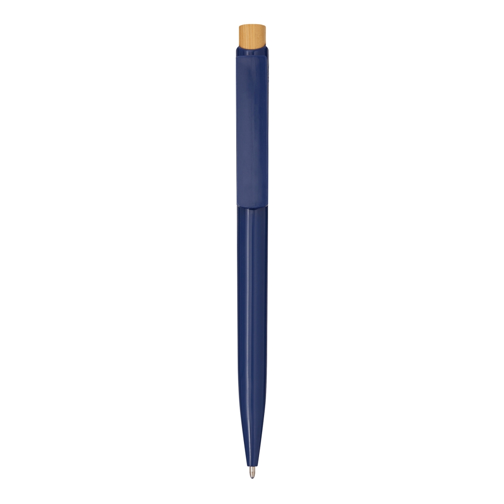 Propiska, tělo z recyklovaného plastu, tlačítkový mechanismus, tlačítko z bambusu, modrý inkoust. Rozměry: 13,5 cm