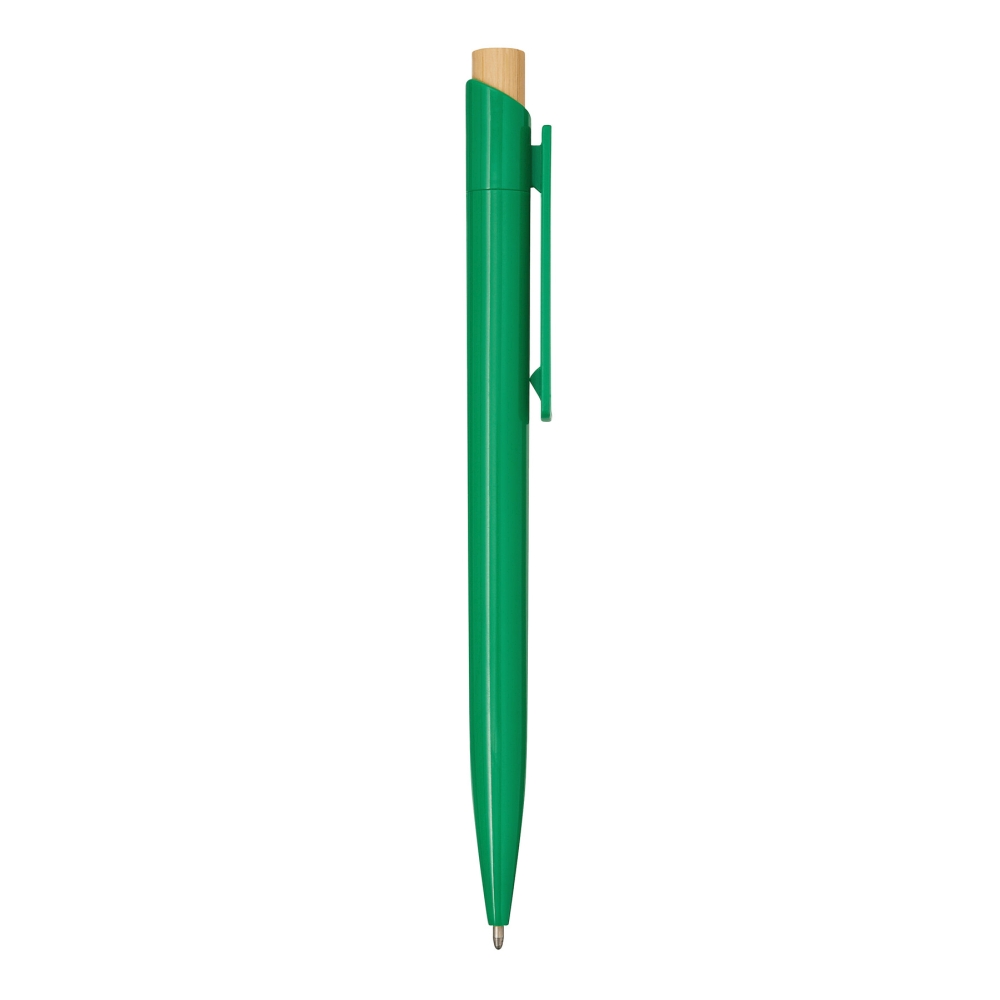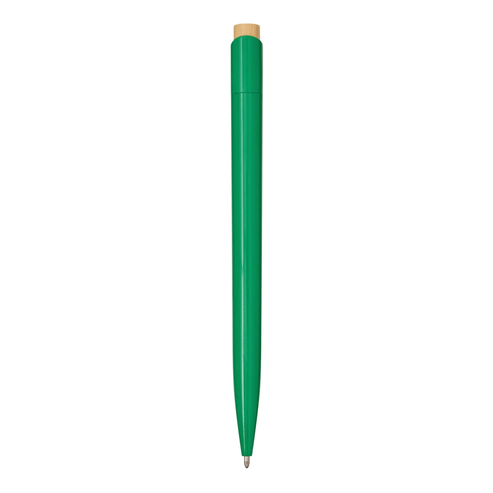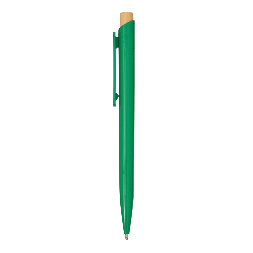 Propiska, tělo z recyklovaného plastu, tlačítkový mechanismus, tlačítko z bambusu, modrý inkoust. Rozměry: 13,5 cm