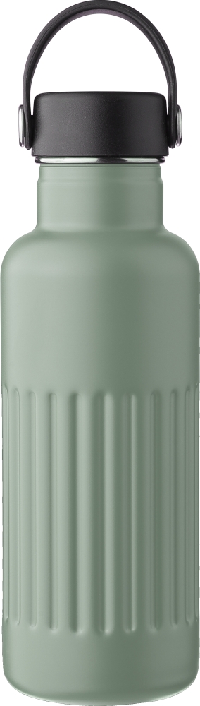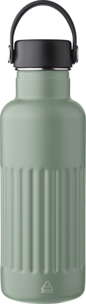 Dvoustěnná láhev na pití z recyklované nerezové oceli (500 ml). Víko z PP a železa s rukojetí z TPE pro snadné přenášení. Na těle je vyryté recyklované logo. Jednotlivě baleno v hnědé kartonové krabici. Rozměry: 7,5 cm x 22,5 cm