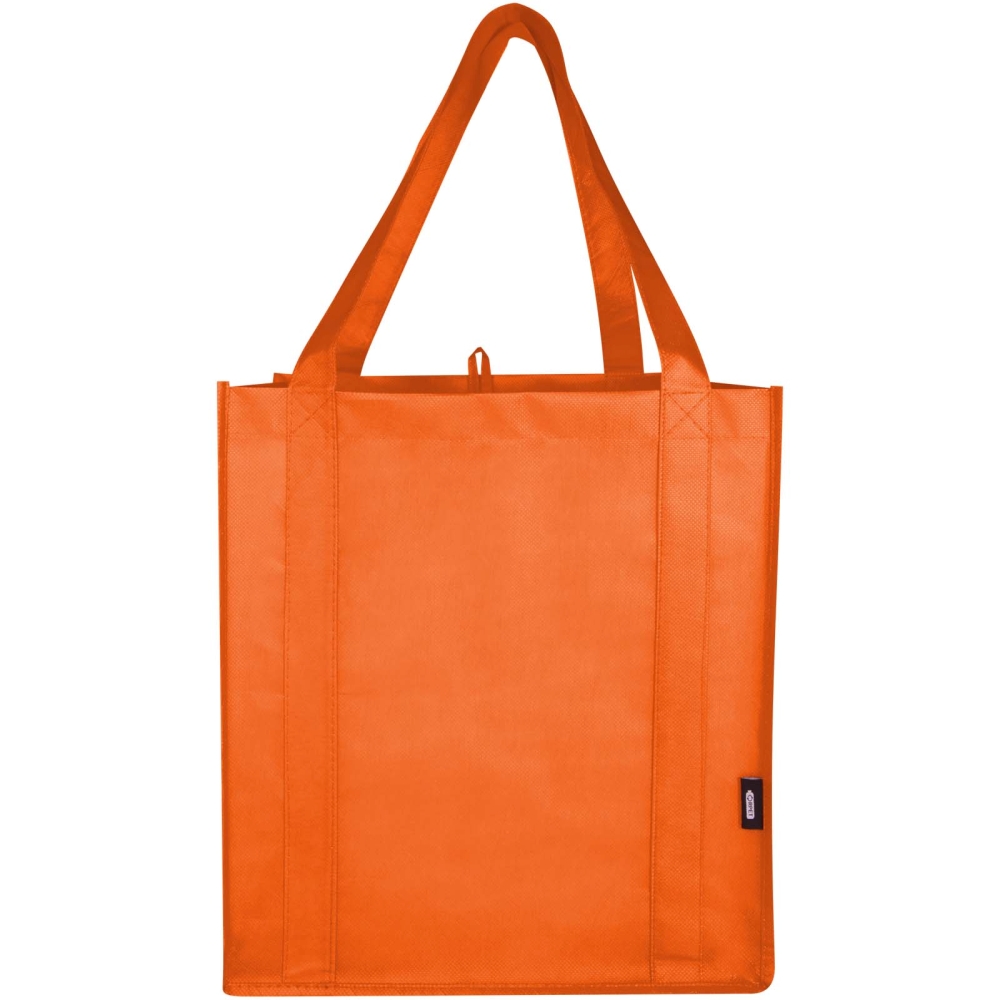 Recyklovaná nákupní taška vyrobená z odolného netkaného RPET má podpůrnou spodní desku, díky níž je univerzální a pevná. Nákupní taška má velkou hlavní přihrádku a ucha o délce 25 cm. Objemová kapacita: 29 litrů. Nosnost do 12 kg. Rozměry: 33 x 36 x 25,4 cm