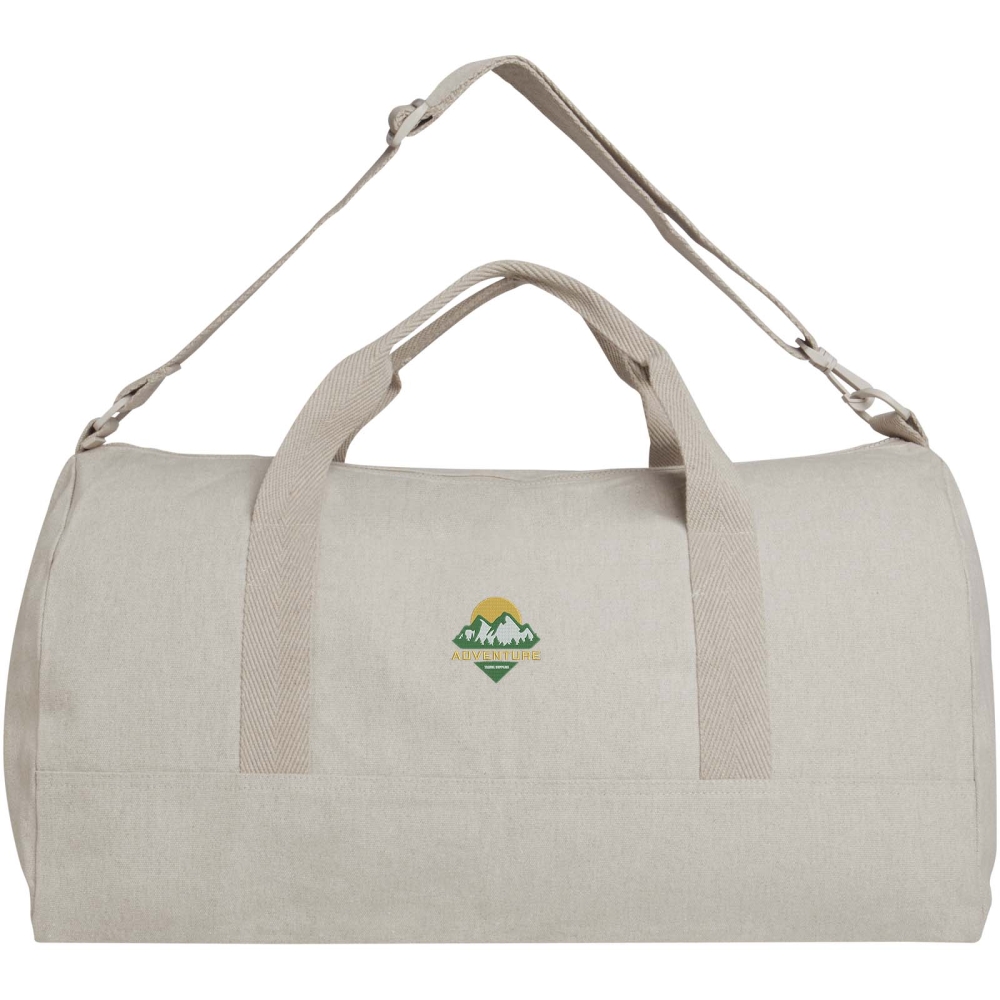 Taška vyrobená z recyklované bavlny s gramáží 500 g/m2 a recyklovaného polyesteru má prostornou hlavní přihrádku pro optimální uložení větších předmětů a malou přední kapsu na drobné předměty, jako je pas nebo telefon. Tašku lze nosit za 2 krátká ucha nebo za roztažitelný a odnímatelný ramenní popruh, který lze nastavit tak, aby byl maximálně pohodlný. Sportovní taška obsahuje recyklovaná vlákna, která používají předem vytříděný odpad, který určuje barvu příze. Rozměry: 55 x 30 x 30 cm