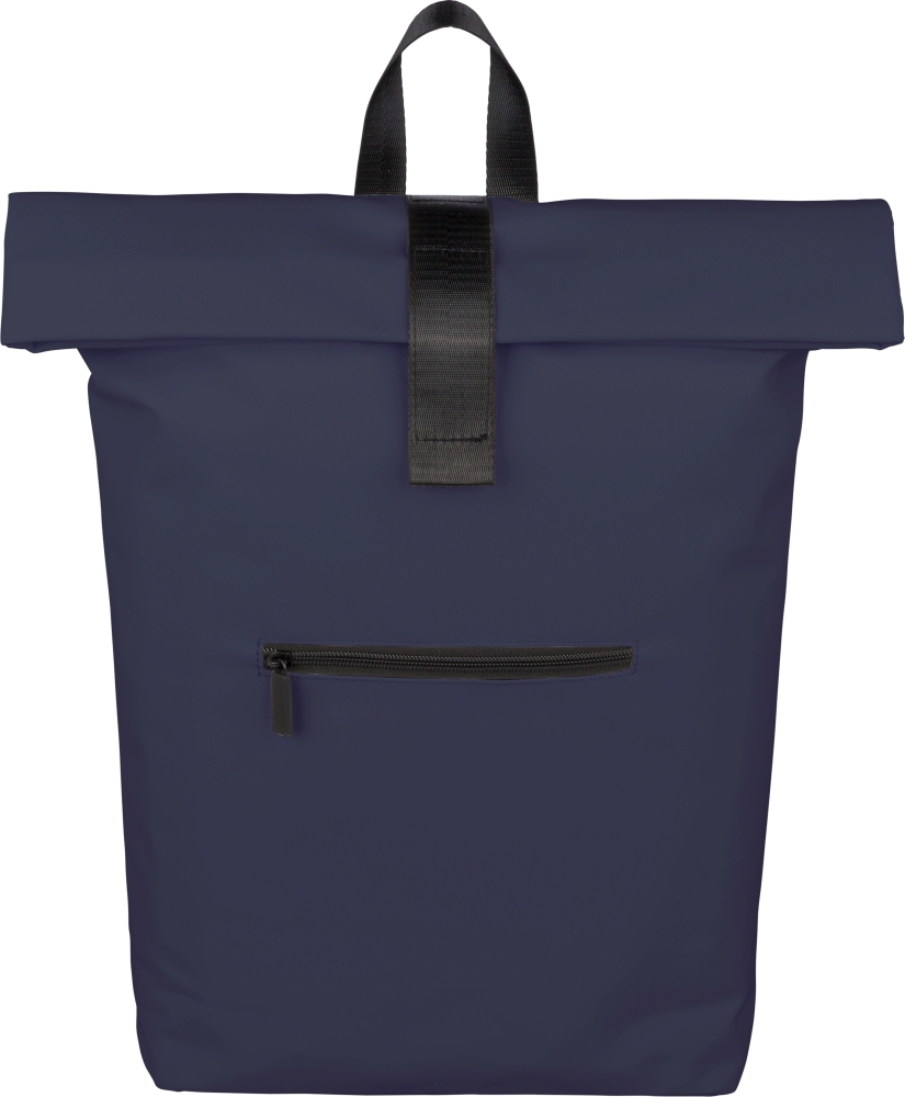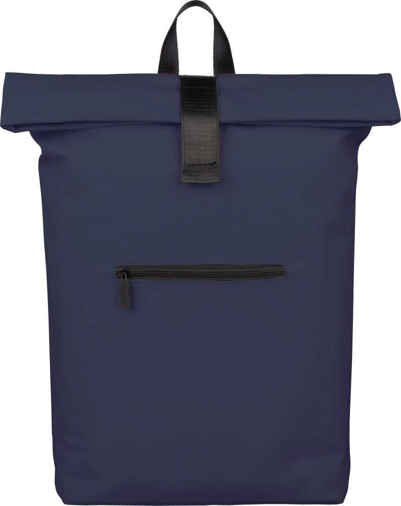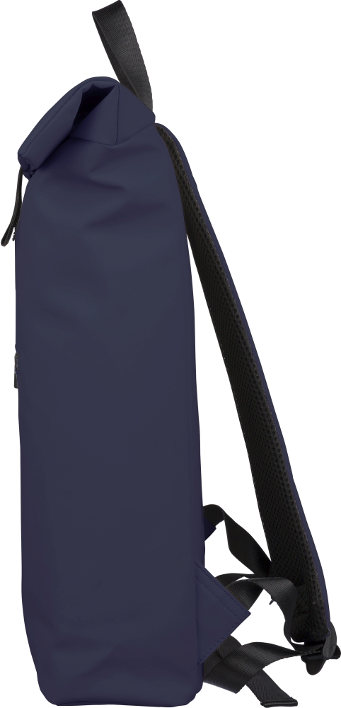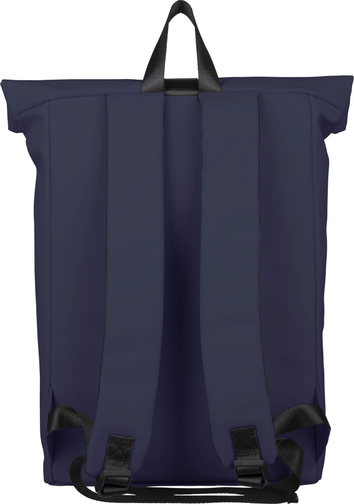 Batoh z recyklovaného PU (19 l) s rolovacím zapínáním a suchým zipem. Má přední kapsu na zip, přihrádku na 16" notebook, podšívku z recyklovaného materiálu 210D, nastavitelné odvětrávané ramenní popruhy, horní rukojeť a uvnitř jeden recyklovaný štítek. Rozměry: 55 cm x 30 cm