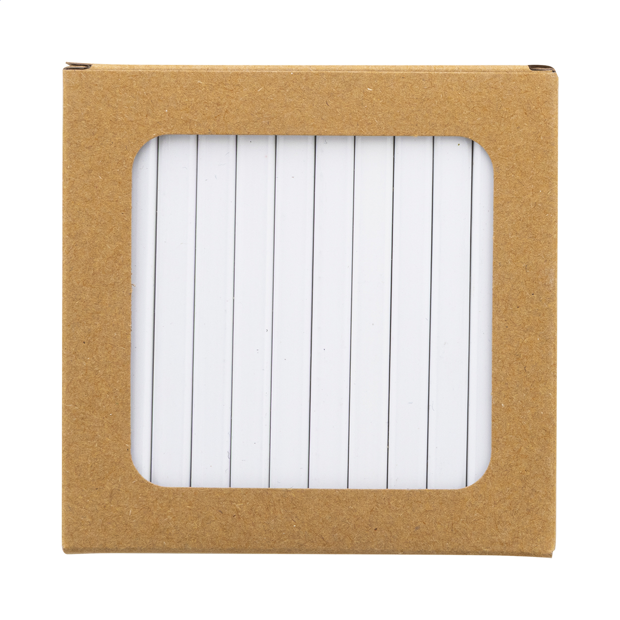 12dílná obdélníková sada dřevěných pastelek s bílou povrchovou úpravou. V krabičce z kraftového papíru s velkým okénkem. Ideální pro celoplošný UV LED tisk.