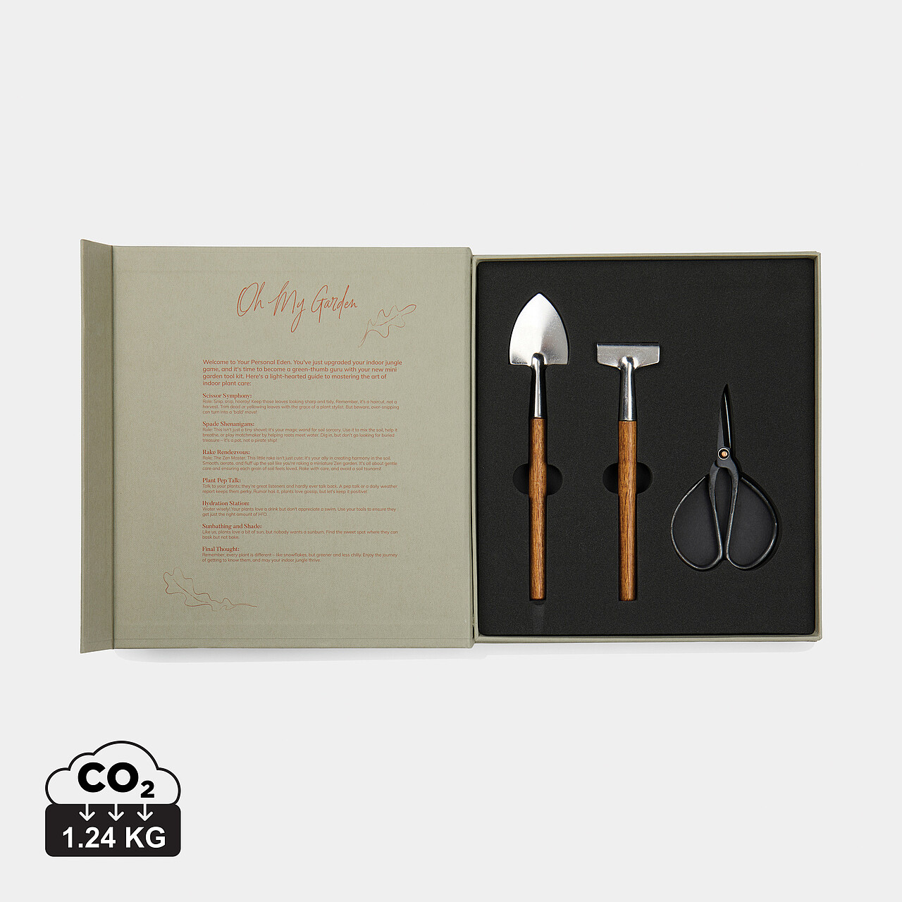 Objevte okouzlující svět zahradničení v interiéru se sadou elegantně zabalenou v dárkové krabici připomínající klasickou knihu. Sada obsahuje hrábě a rýč vyrobené z nerezové oceli a akáciového dřeva spolu s klasickými nůžkami na bylinky z robustního železa. Nástroje vám pomohou snadno pečovat o vaše pokojové rostliny. Jedinečné balení nejen chrání nářadí, také vypráví poutavý příběh. Je tedy ideálním dárkem pro milovníky rostlin. Dárková krabička je vyrobena z FSC® kraftového papíru.