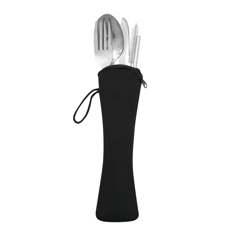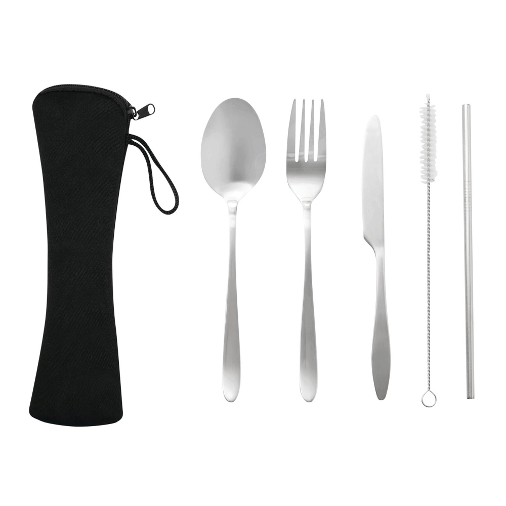 Sada příborů z nerezové oceli, skládá se z nože, vidličky, lžíce, brčka na pití a kartáčku pro snadné čištění brčka z nerezové oceli, v malém neoprenovém pouzdře se zipem a poutkem na přenášení. Rozměry: 21,5 x 7 cm