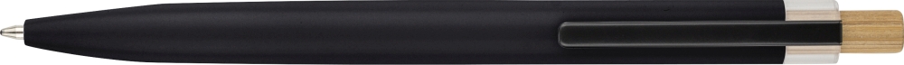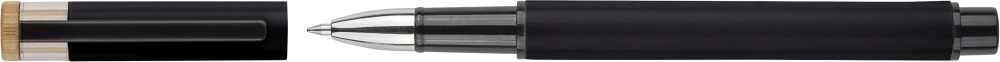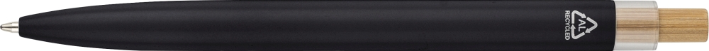 Sada lakovaných per z recyklovaného hliníku s kuličkovým a rollerovým perem. Bambusové tlačítko, rPET lem a kovový klip; roller obsahuje bambusový/rPET detail víčka a odpovídající klip. Obě pera s gravírovaným logem z recyklovaného materiálu. Píše přibližně 700 m (kuličkové pero) a 500 m (roller). Modrý inkoust. Baleno v barevné dárkové krabičce z recyklovaného kartonu. Rozměry: 1,4 cm x 17,8 cm