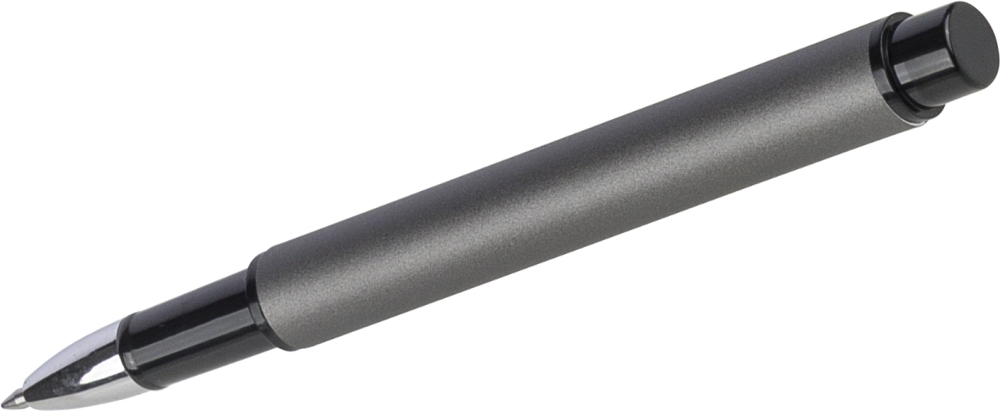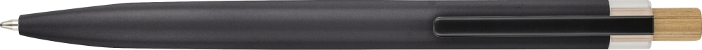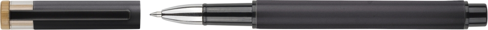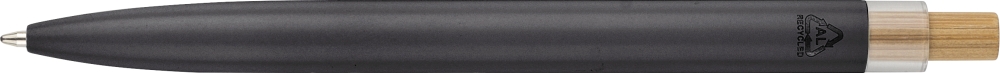 Sada lakovaných per z recyklovaného hliníku s kuličkovým a rollerovým perem. Bambusové tlačítko, rPET lem a kovový klip; roller obsahuje bambusový/rPET detail víčka a odpovídající klip. Obě pera s gravírovaným logem z recyklovaného materiálu. Píše přibližně 700 m (kuličkové pero) a 500 m (roller). Modrý inkoust. Baleno v barevné dárkové krabičce z recyklovaného kartonu. Rozměry: 1,4 cm x 17,8 cm