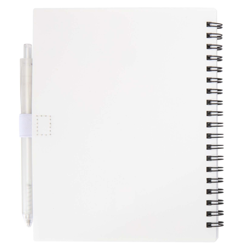 Poznámkový blok s měkkou vazbou je vyroben z recyklovaného plastu a má 70 tečkovaných listů papíru o gramáži 70 g/m2. Zápisník má zaoblené rohy a poutko na pero. Velikost zápisníku: 140 × 178 mm. Propiska je rovněž vyrobena z recyklovaného plastu. Barva inkoustu: Modrá. Délka psaní: 1000 metrů. Rozměr hrotu: 1,0 mm. Rozměry: 17,8 x 14 cm