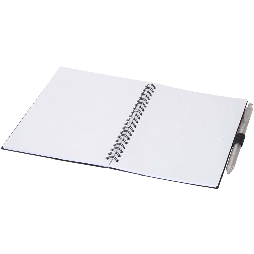 Poznámkový blok s měkkou vazbou je vyroben z recyklovaného plastu a má 70 tečkovaných listů papíru o gramáži 70 g/m2. Zápisník má zaoblené rohy a poutko na pero. Velikost zápisníku: 140 × 178 mm. Propiska je rovněž vyrobena z recyklovaného plastu. Barva inkoustu: Modrá. Délka psaní: 1000 metrů. Rozměr hrotu: 1,0 mm. Rozměry: 17,8 x 14 cm