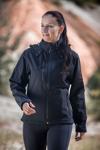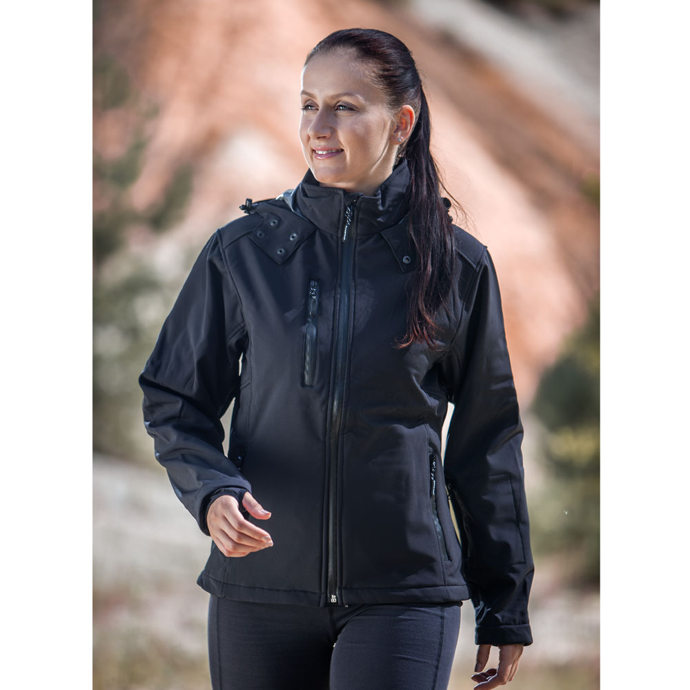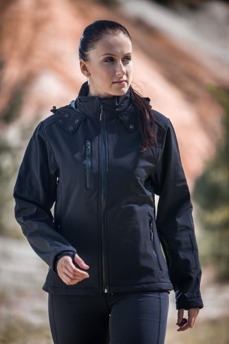 Lehká softshellová dámská bunda značky Schwarzwolf zajišťující voděodolnost i větruvzdornost. Má zpevněná ramena, dvě boční kapsy, kapsičku pro skipas či mobil na rukávu. Rukávy jsou zakončené manžetou a mají vypracovaný otvor na palec. Bunda má kapuci v límci s možností stahování, s kšiltem a ochrannou protivětrnou légou na obličej. Materiál: 96% pongee polyester, 4% spandex polyester. Výška vodního sloupce v ploše: 20 000 mm, prodyšnost: 3500 g/m2/24 hod. Doporučená technologie tisku: výšivka. Uhlíková stopa: gCO2 e12599.