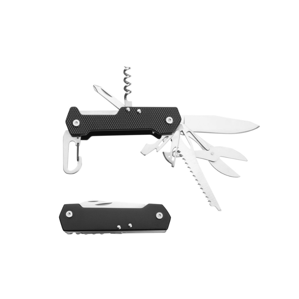 Multifunkční kapesní nůž značky Schwarzwolf. Obsahuje 9 nástrojů – nůž, nůžky, pilku, vývrtku, otvírák lahví, otvírák na konzervy, plochý šroubovák, křížový šroubovák a karabinku. Rukojeť je z jedné strany v moderním vroubkovaném designu, z druhé strany hladká pro umístění Vašeho loga. Baleno v dárkové krabičce. Materiál: nářadí – nerezová ocel 2Cr13, rukojeť – anodizovaný hliník. Rozměry: v zavřeném stavu 9,7 × 2,7 × 1,9 cm. Uhlíková stopa: gCO2 e1727.