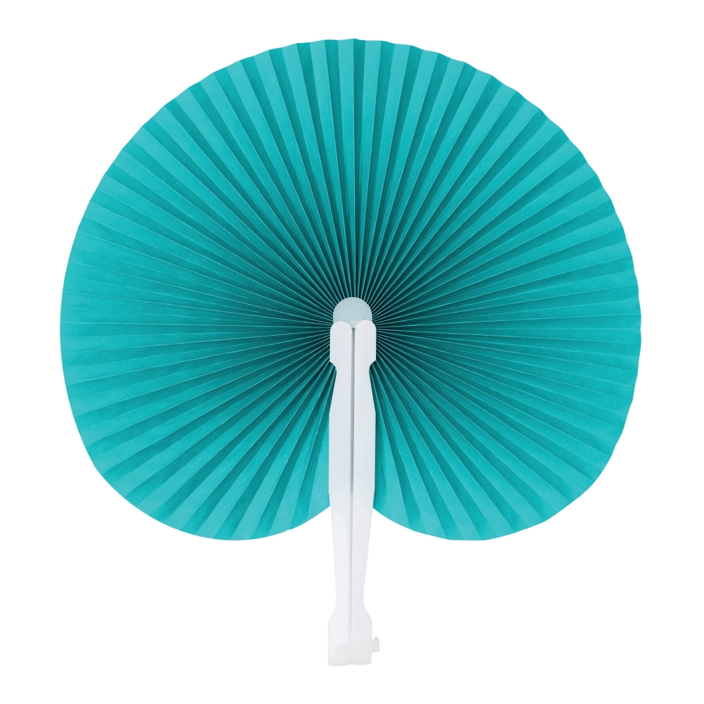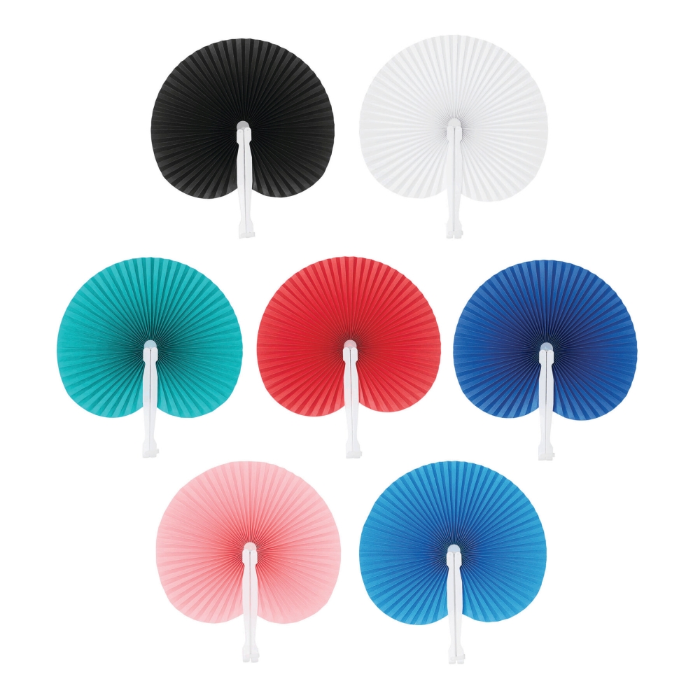 Skládací papírový vějíř, upevněný na odolné plastové rukojeti s uzavírací sponou. Rozměry: 24 x 26 / 14,5 x 2 cm