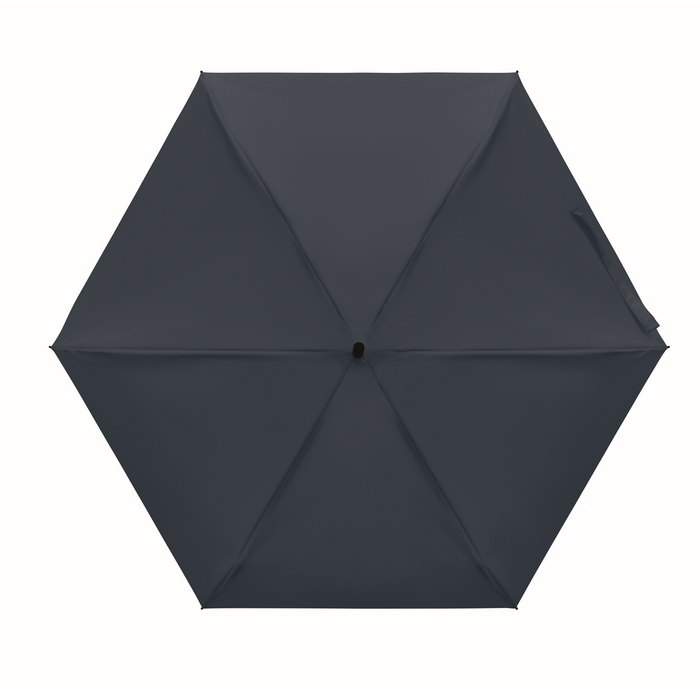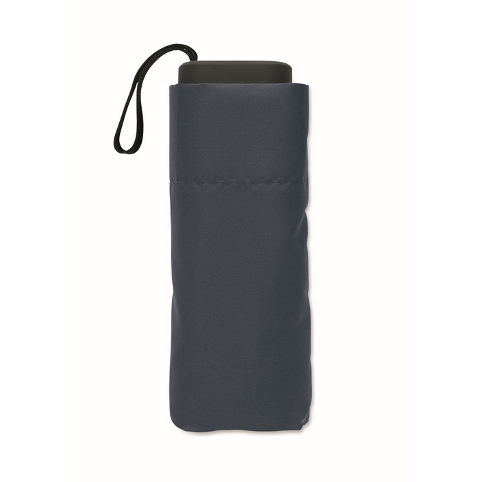 19palcový manuální skládací deštník z 190T pongee v obalu. Kovový a sklolaminátový větruodolný rám, černá pogumovaná rukojeť s popruhem na zápěstí. Kompaktní velikost, ve složeném stavu 17 cm. Rozměry: O90 x 17 cm