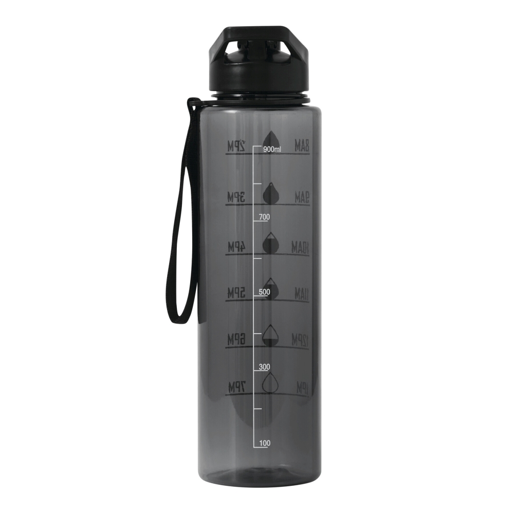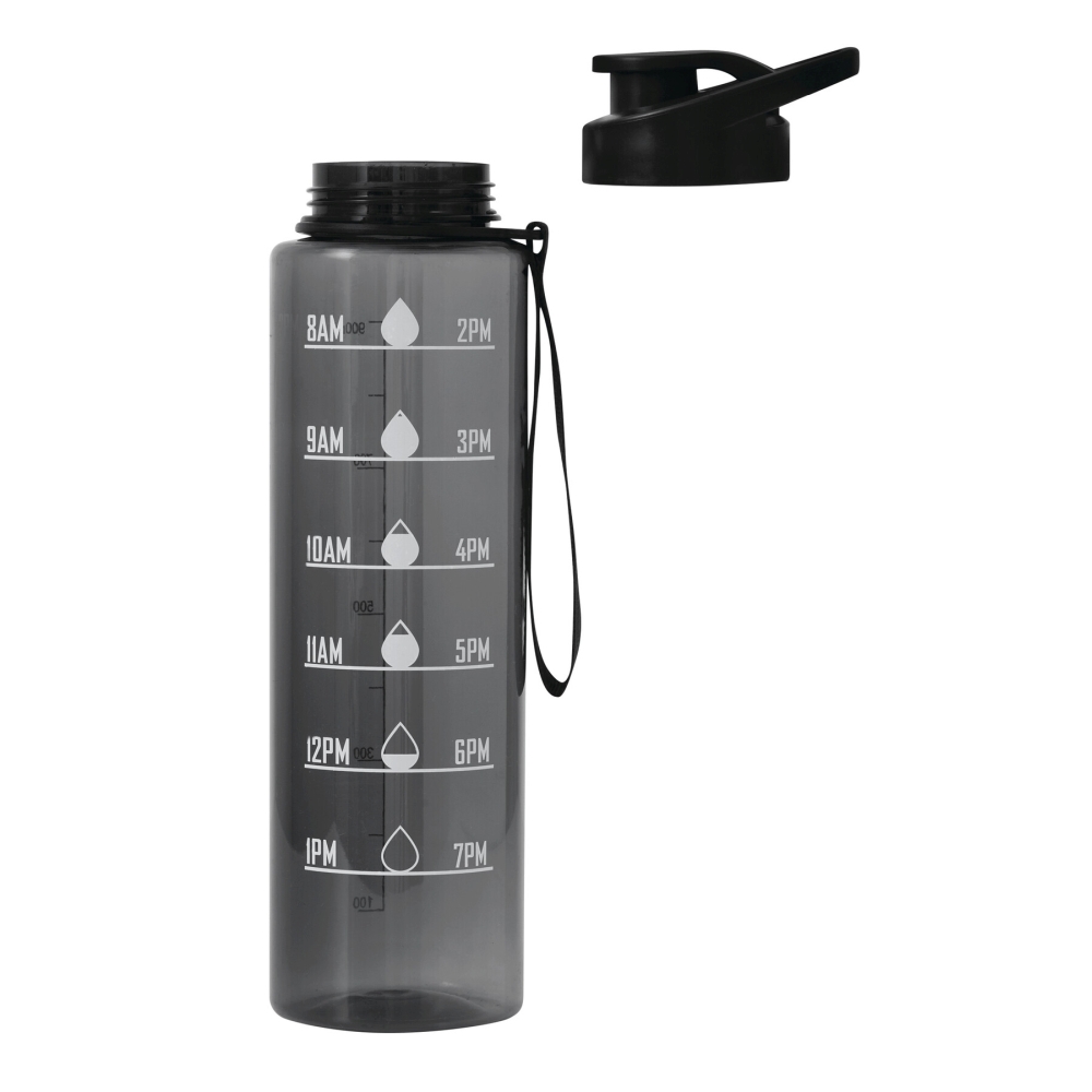 Sportovní láhev na vodu. Průhledná, barevná láhev z odolného PETG, barevně sladěný plastový šroubovací uzávěr se silikonovým těsněním, výklopný výlevkový hrdlo a rukojeť pro přenášení, motivační stupnice času a objemu vody (denní doba / ml), s poutkem na ruku, objem cca 1 000 ml. Rozměry: O7,5 x 27,4 cm