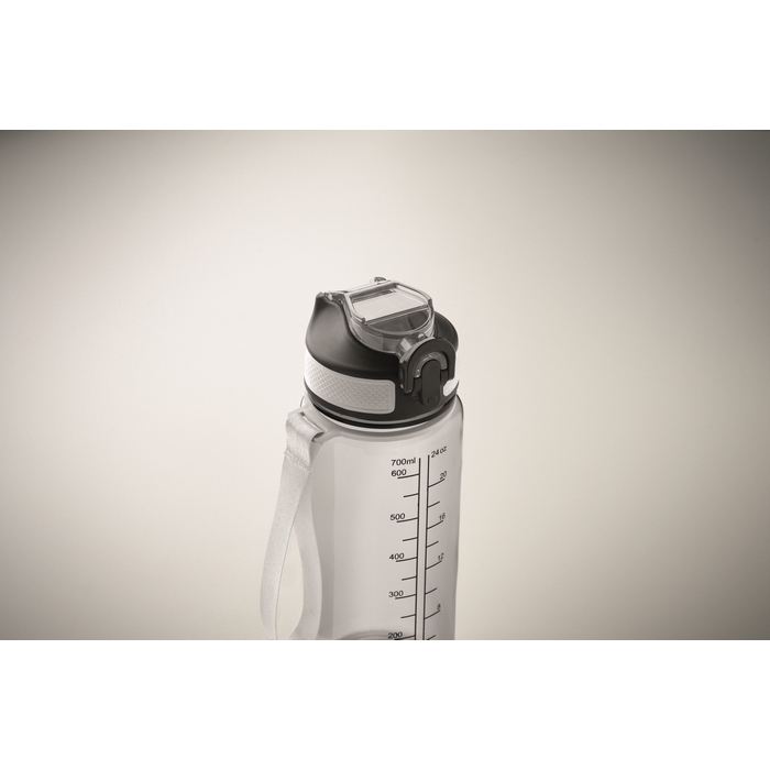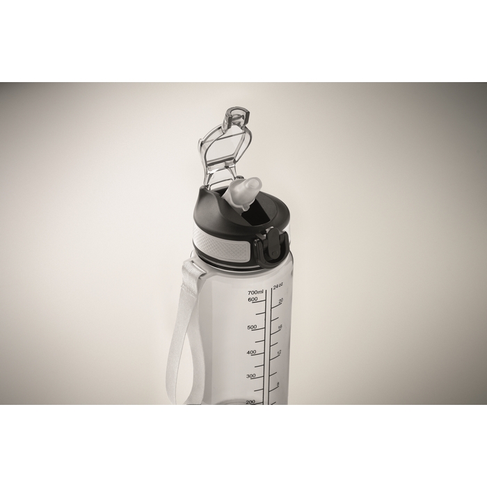 Motivační sportovní láhev na vodu z RPET s integrovaným brčkem, měkkým silikonovým náustkem, víčkem otevíratelným jednou rukou a bezpečnostním zámkem. Poutko z RPET saténu. Objem 700 ml. Neteče. Rozměry: O7.7 x 21.5 cm