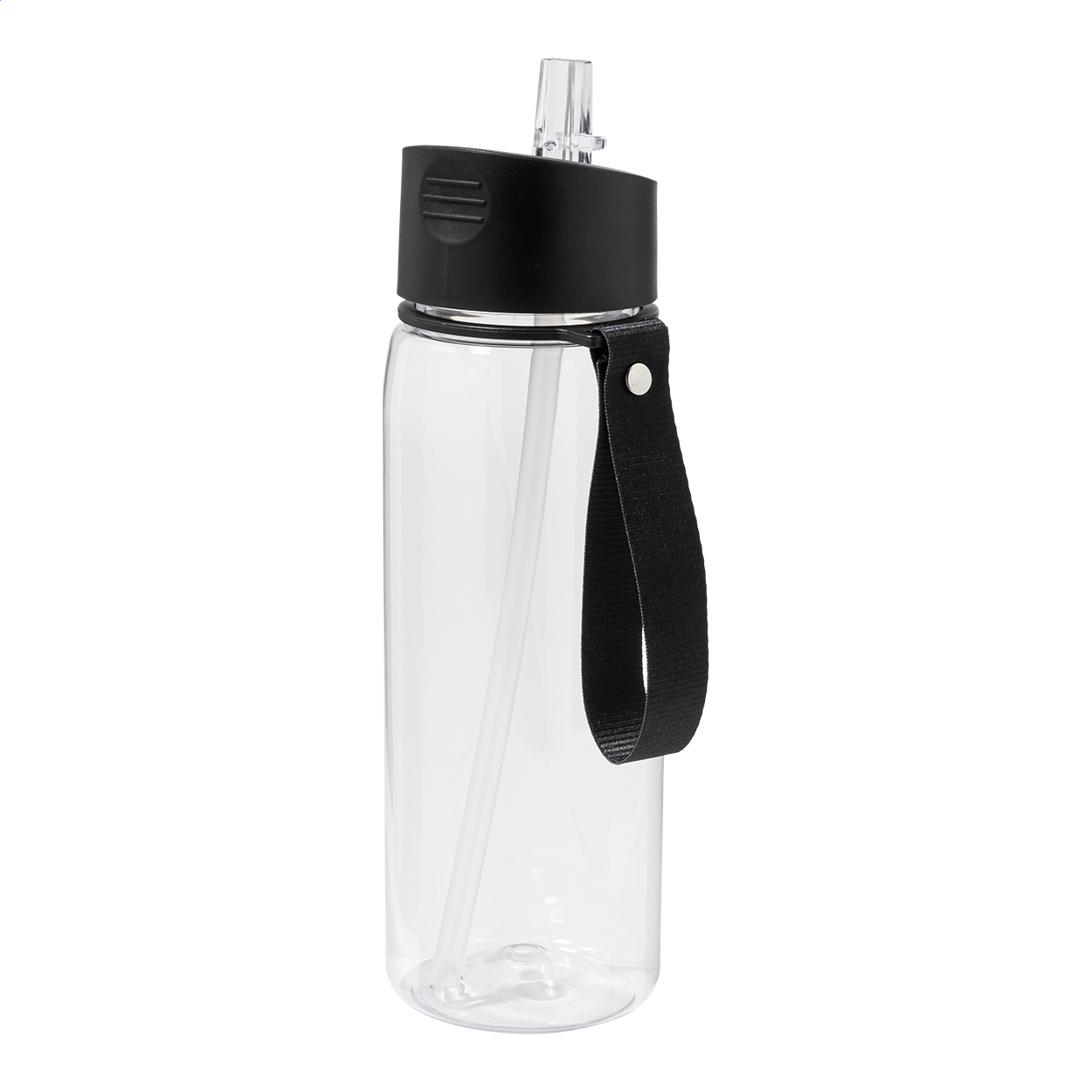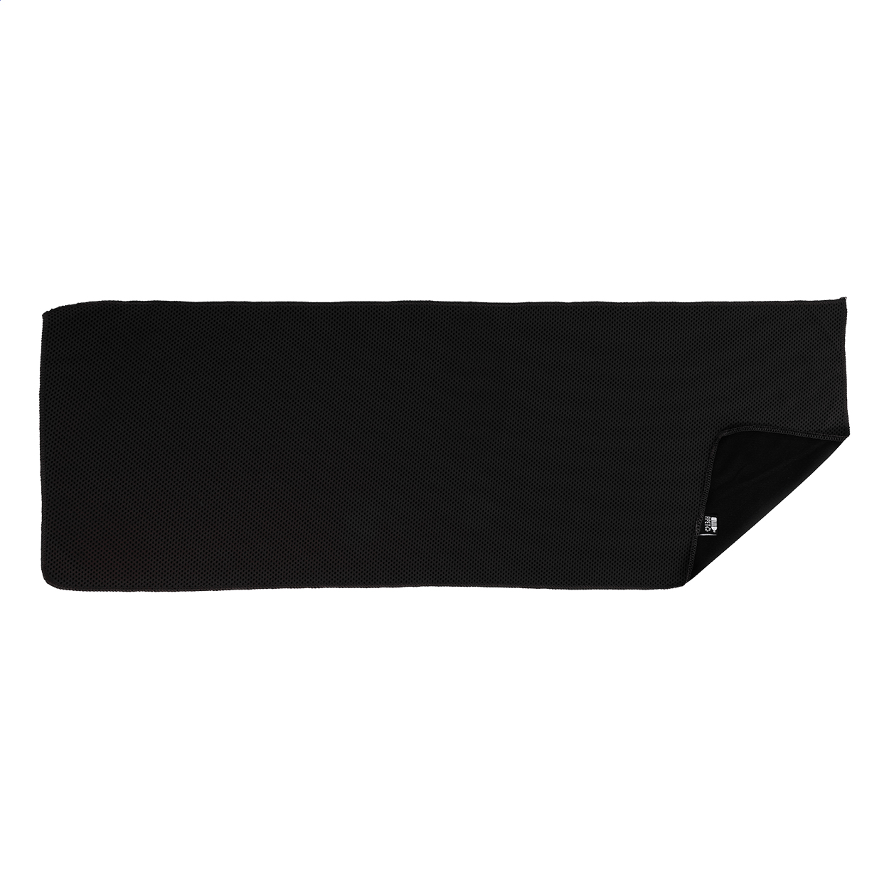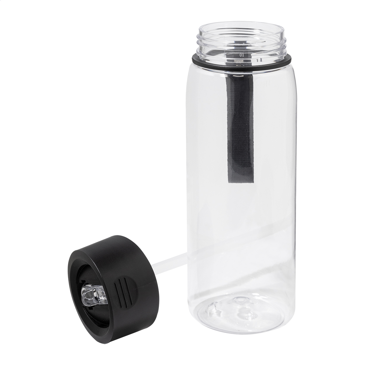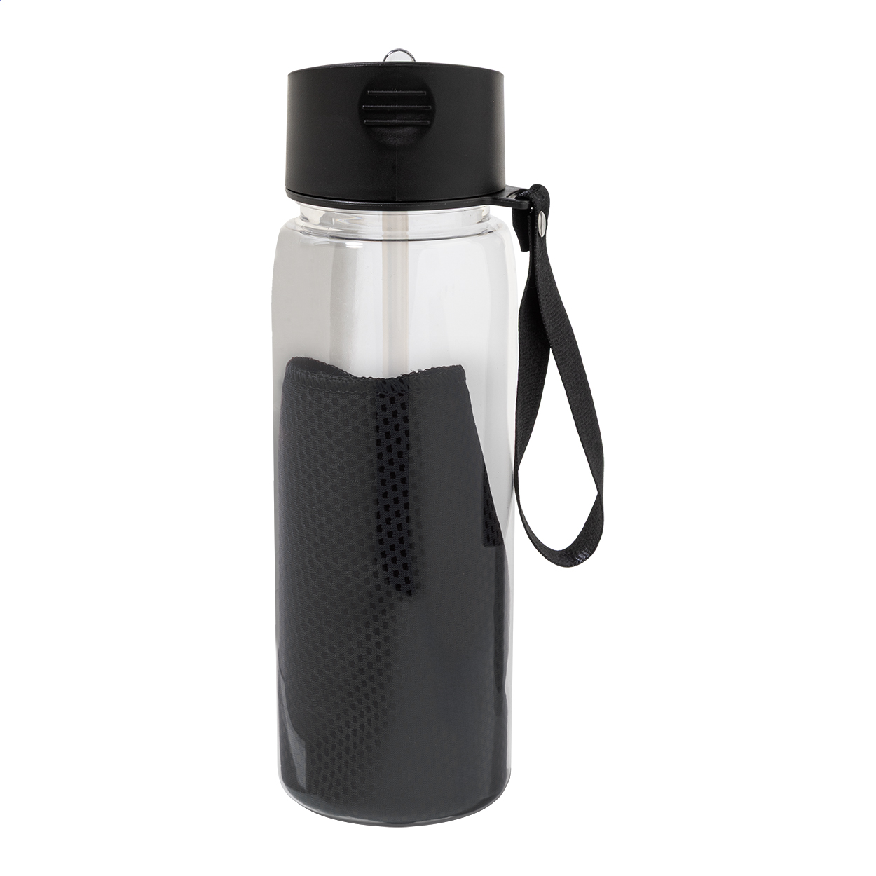 Chladicí sportovní ručník z RPET polyesteru v RPET sportovní lahvi s PP víčkem typu flip-top, integrovaným brčkem a přenosným popruhem. Objem 800 ml. Neobsahuje BPA. Není vhodná pro sycené nápoje. Velikost ručníku: 30 × 80 cm.