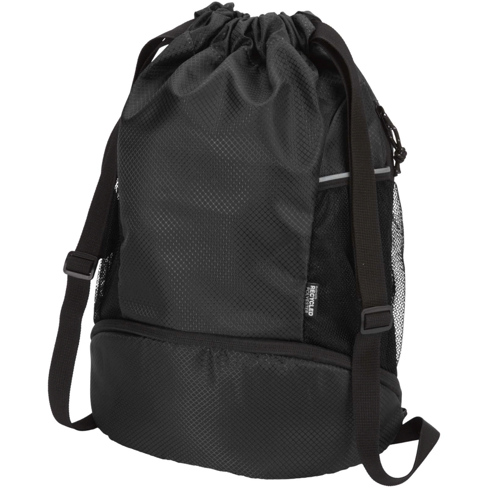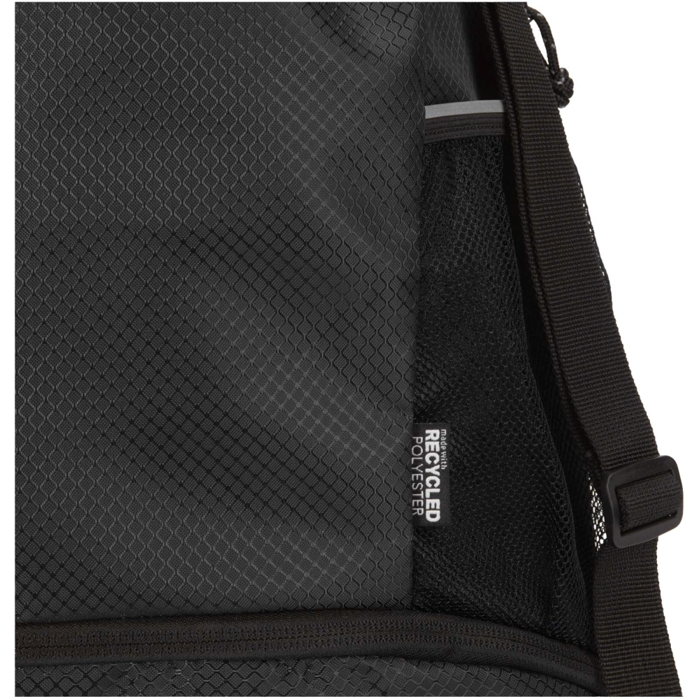 Sportovní stahovací batoh je vyroben z recyklované ripstopové tkaniny s vodoodpudivou úpravou, podšívkou z RPET a reflexními prvky. Je určena pro lidi s aktivním životním stylem a je vhodná pro každodenní cvičení a sportovní aktivity. Taška má prostorný hlavní oddíl, který pojme oblečení, ručník nebo třeba basketbalový míč. Do samostatné spodní přihrádky se vejdou boty nebo použité oblečení odděleně od ostatních předmětů. Součástí jsou také dvě boční síťované kapsy s reflexními detaily, jedna skrytá kapsa na zip na cennosti a nastavitelné ramenní popruhy pro pohodlné nošení. Rozměry: 29 x 47 x 12 cm