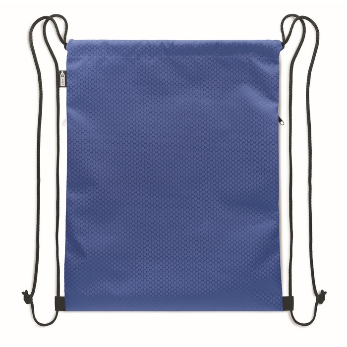 Stahovací batoh z polyesteru RPET 420D s vertikální boční kapsou na zip a podšívkou z materiálu RPET 210D. Pevné šňůrky, objem 4,5 l, maximální nosnost 5 kg. Rozměry: 34 x 42 cm