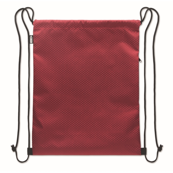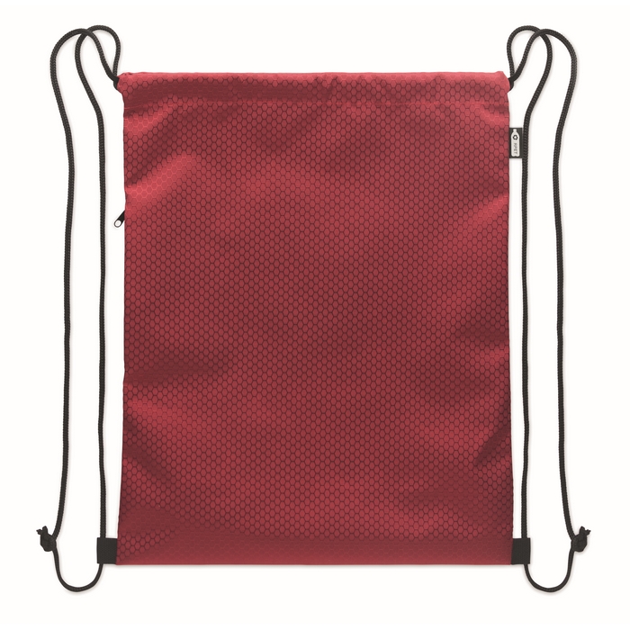 Stahovací batoh z polyesteru RPET 420D s vertikální boční kapsou na zip a podšívkou z materiálu RPET 210D. Pevné šňůrky, objem 4,5 l, maximální nosnost 5 kg. Rozměry: 34 x 42 cm