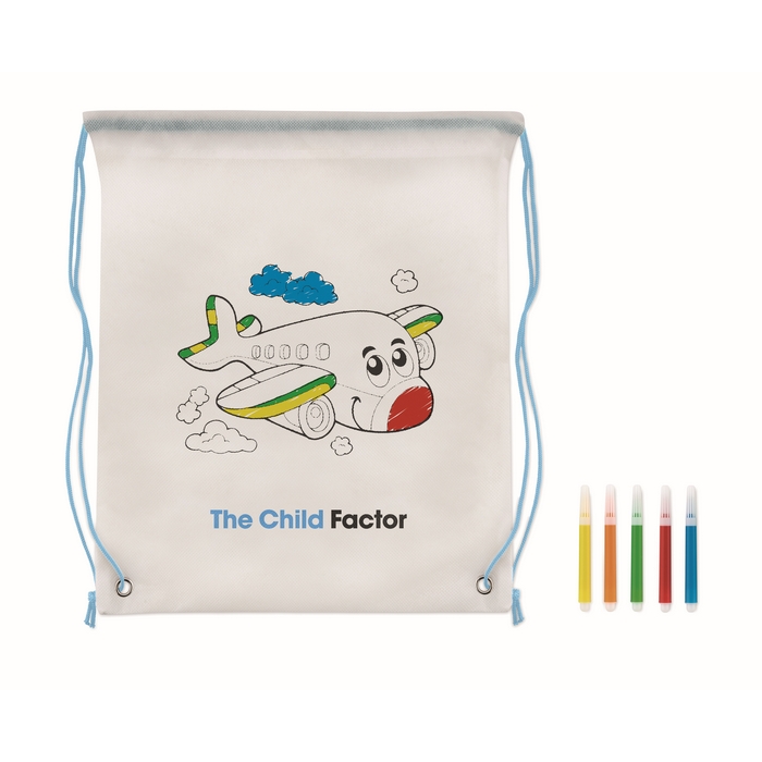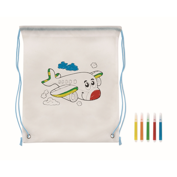Stahovací batoh z netkané textilie 80 gr/m2, vymalovávací. 5 fixů. Rozměry: 28 x 35 cm