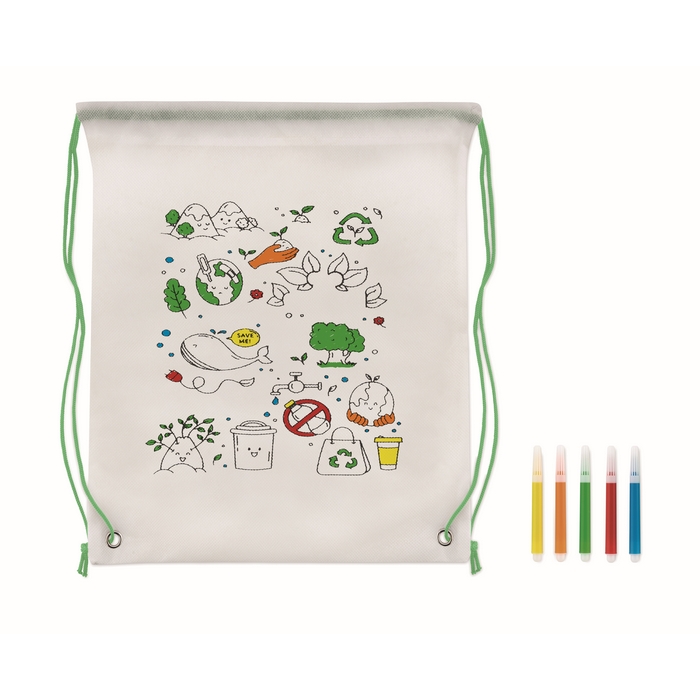 Stahovací batoh z netkané textilie 80 gr/m2, vymalovávací. 5 fixů. Rozměry: 28 x 35 cm
