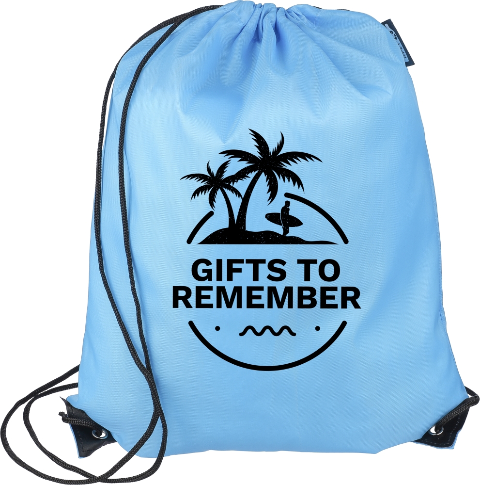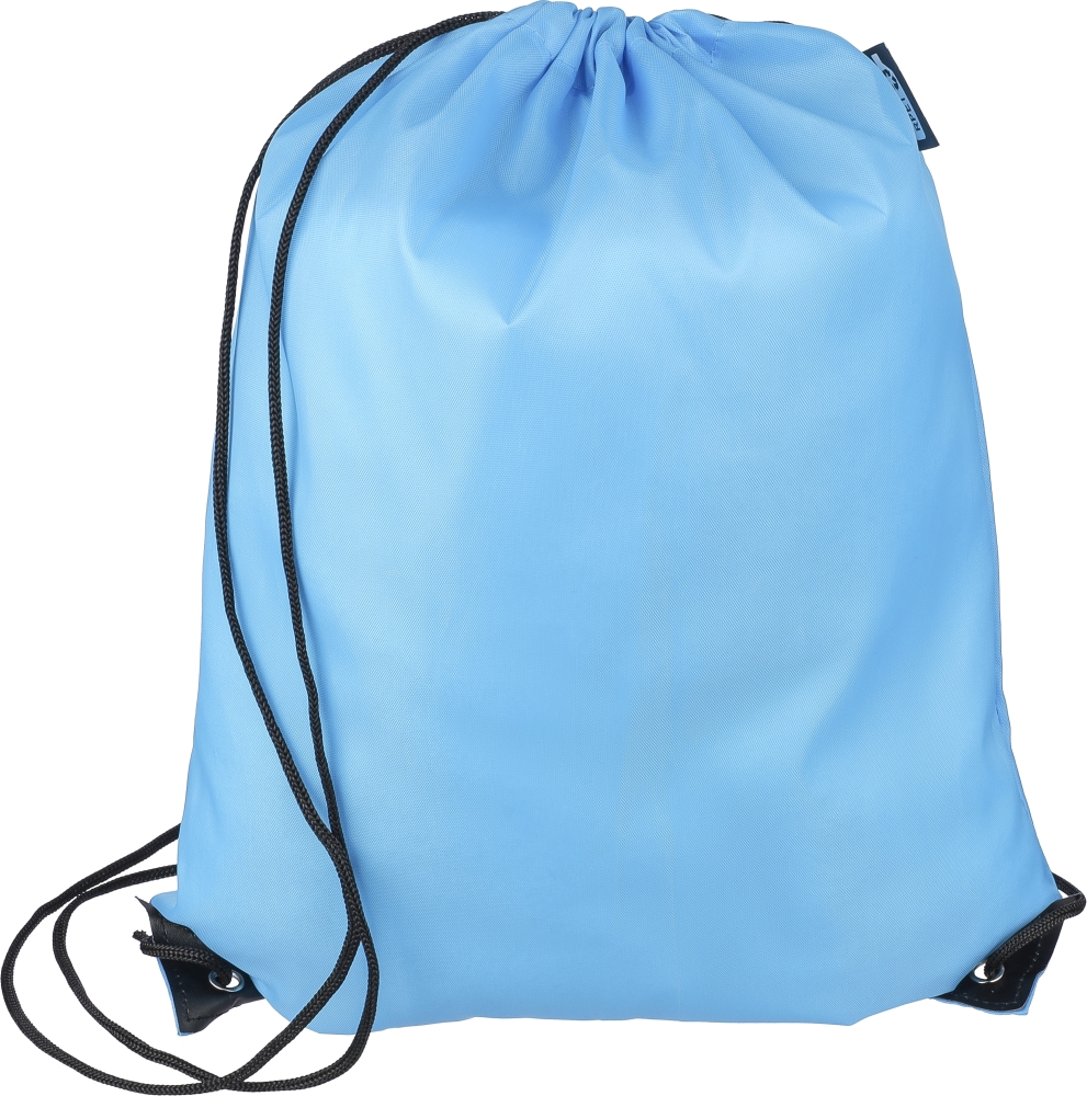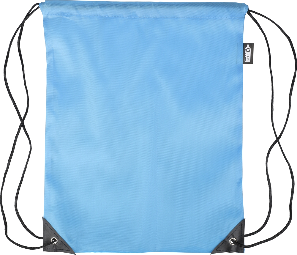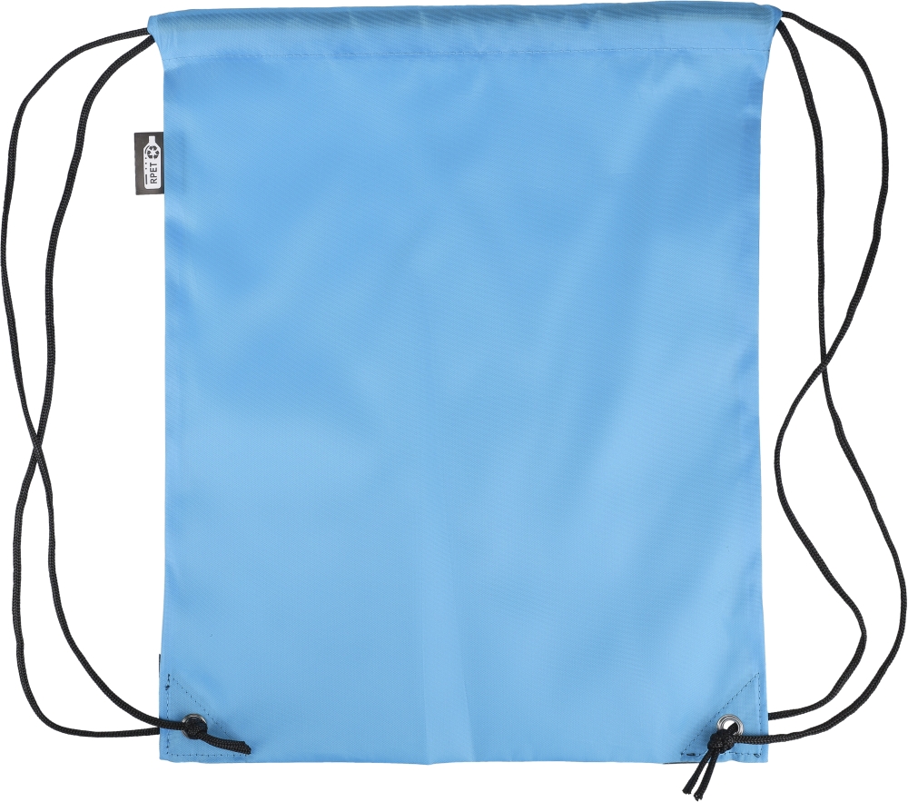 Stahovací batoh z polyesteru 210D se dvěma černými PU rohy na přední straně a vnitřním prošitím. Má černou nylonovou šňůrku na každé straně, zapínání na stahovací šňůrku a jednu vnitřní přihrádku. Objem: 5 l. Nosnost: 7 kg. Včetně štítku z rPET. Rozměry: 34 x 0,1 x 42 cm